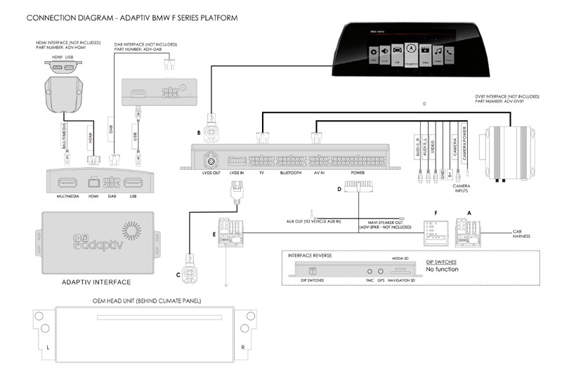 Adaptiv - elektronický modul, ktorý umožňuje rozšírenie existujúcich jednotiek s OEM monitorom o navigáciu, prehrávanie videa, vstup USB, iPhone, SD kartu, HDMI, AUX, pripojenie zadnej parkovacej kamery, DAB rádiového tunera alebo DVB-T televízie. Všetko je ovládané pomocou otočného ovládača idrive.