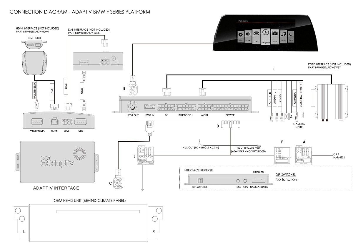 Adaptiv - elektronický modul, ktorý umožňuje rozšírenie existujúcich jednotiek s OEM monitorom o navigáciu, prehrávanie videa, vstup USB, iPhone, SD kartu, HDMI, AUX, pripojenie zadnej parkovacej kamery, DAB rádiového tunera alebo DVB-T televízie. Všetko je ovládané pomocou otočného ovládača idrive.