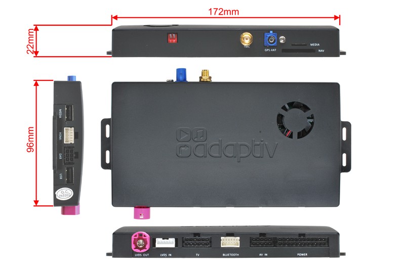 Adaptiv - elektronický modul, ktorý umožňuje rozšírenie existujúcich jednotiek s OEM monitorom o navigáciu, prehrávanie videa, vstup USB, iPhone, SD kartu, HDMI, AUX, pripojenie zadnej parkovacej kamery, DAB rádiového tunera alebo DVB-T televízie. Všetko je ovládané pomocou dotykového displeja.