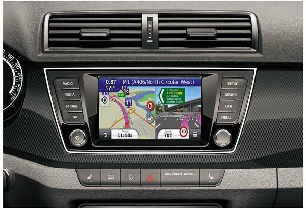 Inovujte svoje vozidlo Škoda multimediálnym systémom Kenwood s navigáciou. Ovládanie navigácie pomocou dotykového panelu. Hlasová navigácia s názvom cesty (príklad: „Odbočte vpravo na Regent Street“). Funkcia Lane Assist. 3D pamiatky a budovy.