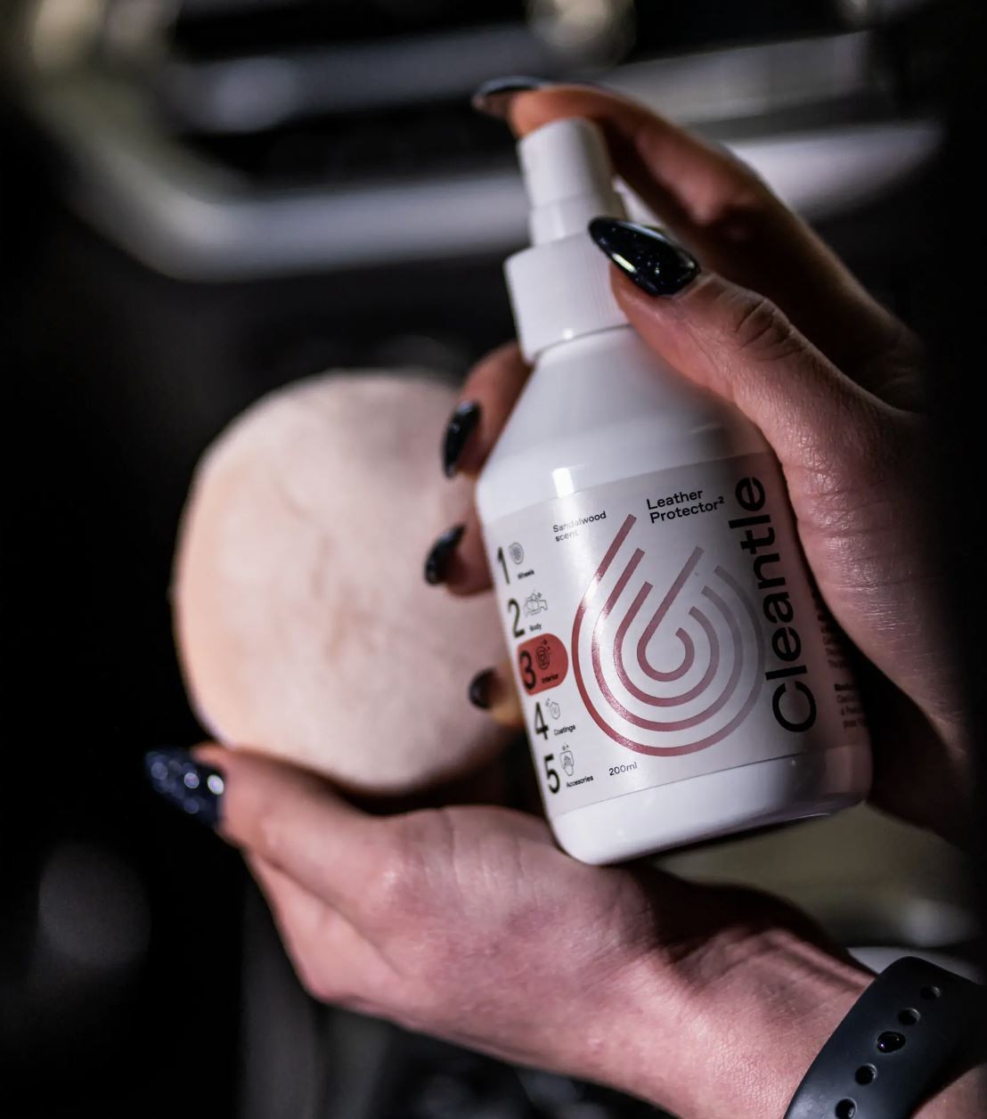 Cleantle Leather Protector² je určený na starostlivosť a ochranu koženého čalúnenia. Odďaľuje zašpinenie čalúnenia a robí povrch menej náchylným na zafarbenie. Jeho zloženie je zmesou polymérov a prírodných voskov, ktoré kožu hydratujú a vyživujú. Po aplikácii povrch mierne stmavne, kĺže a je mäkký na dotyk. Výrobok obsahuje UV filtre, ktoré chránia kožu pred vyblednutím. S ohľadom na bezpečnosť užívateľa a čalúnenia zaistili v Cleantle najlepšie možné zloženie produktu. Leather Protector² sa skladá zo zmesi polymérov a prírodných voskov, vďaka ktorým produkt zanecháva kožené čalúnenie dokonale vláčne a vyživené. Pre správnu aplikáciu Leather Protector² musíte najskôr pripraviť povrch pre aplikáciu. Oplatí sa siahnuť po Leather Cleaner² a efektívne vyčistiť kožené čalúnenie pomocou profesionálnej kefy na kožu a látky. Prípravok aplikovaný na taký základ bude mať predĺžený účinok a efekt hydratovaného, stmaveného a chráneného čalúnenia pred špinou alebo UV žiarením vám zostane dlhšie.