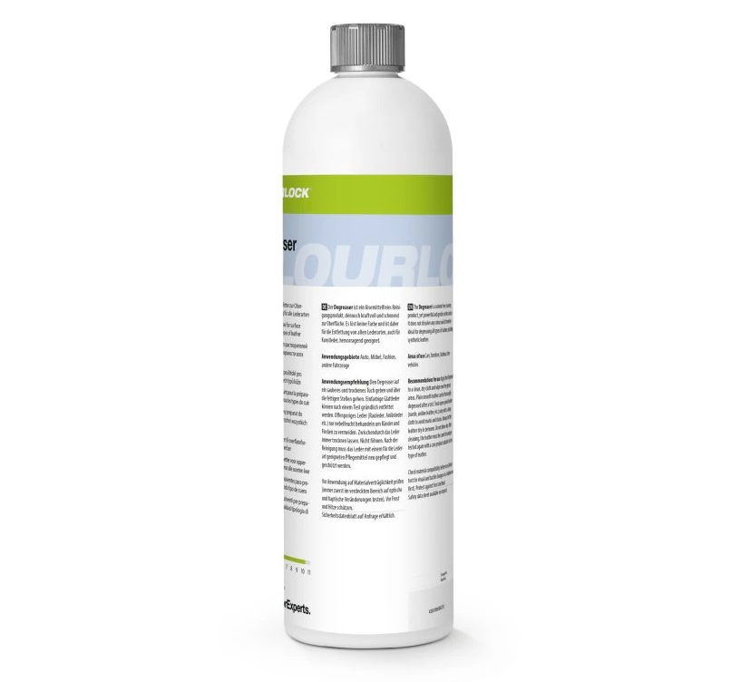 odmasťovač bez rozpúšťadiel, ktorý účinne a šetrne čistí mastné miesta na koži aj syntetickej koži bez toho, aby rozpúšťal farbu, 1 l