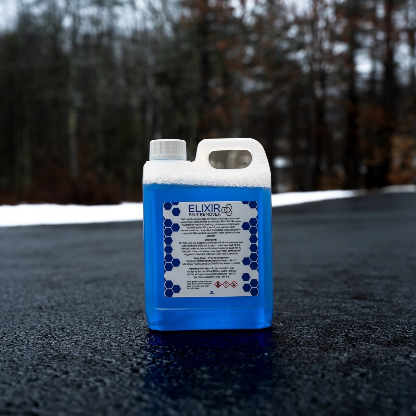 Soľ urýchľuje koróziu a spôsobuje koróziu komponentov podvozku a zavesenia kolies. Elixír Salt Remover neutralizuje cestnú soľ, čím pomáha minimalizovať koróziu a predlžuje tak životnosť vášho vozidla. Elixir Salt Remover je penivý prípravok na predumytie s nízkym pH špeciálne vyvinutý na odstránenie posypovej soli, piesku a anorganického cestného filmu. Penivý charakter čistiaceho prostriedku umožňuje dlhšie trvajúce pôsobenie, rozkladanie soli a iných nečistôt v priebehu času alebo umožňuje čistenie povrchu pomocou kefy (v prípade potreby) na ďalšie odstránenie nahromadených nečistôt. Odstraňovač soli je špeciálne navrhnutý na odstránenie viazaných kryštalických častíc soli z povrchu, ktoré by inak neboli odstránené bežným umývacím procesom alebo použitím bežných čistiacich prostriedkov. Cestná soľ reaguje s organickými molekulami, ako sú palivo, olej a iné anorganické molekuly z povrchu vozovky, a vytvára povlak na povrchu vozidla, preto je potrebný tento cielený odstraňovač soli. Hoci sa soľ môže rozpúšťať vo vode, viazané zrnká soli sa nedajú ľahko odstrániť samotným tlakovým umývaním alebo ručným umývaním, dokonca aj dlhodobé ponorenie do vody odstráni len malé percento viazaných častíc soli. Elixír by sa mal zaradiť do procesu umývania ako dvojfázová fáza pred umývaním, najmä v zime. Spodné tesnenia na klasických automobiloch sa časom stanú krehkými, popraskajú a odhalia nechránené kovové povrchy, a práve tu soľ a voda spôsobujú problém, vnikajú do trhlín a urýchľujú vznik hrdze. Staršie vozidlá sú na to obzvlášť náchylnéHlavné vlastnosti