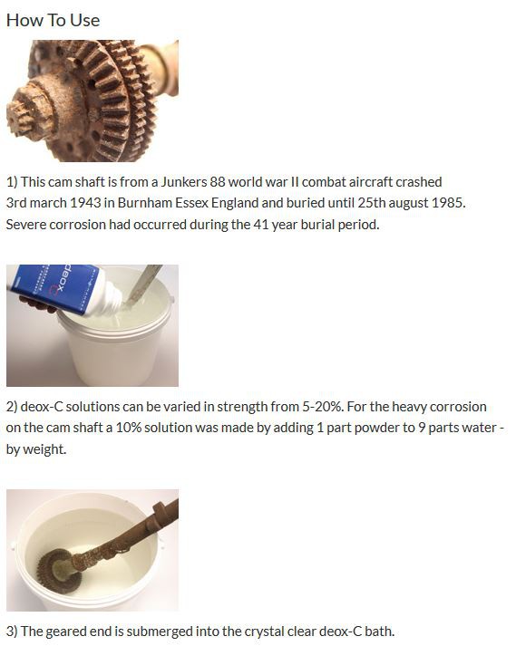 Deox-C je kryštalický, 100% aktívny produkt proti korózii, ktorý je určený na odstraňovanie korózie z ocele, nerezu a väčšiny železných materiálov. Prípravok sa rozpustí vo vode a vytvorí kúpeľ s výkonnou kvapalinou na odstránenie hrdze. Deox-C je mimoriadne úsporný, napríklad len 1 kg Deox-C vytvorí až 20 litrov silného kúpeľa na odstraňovanie hrdze. Dokáže odstrániť aj veľmi ťažkú koróziu, ale je bezpečný na použitie aj na najjemnejšie predmety. Je vhodný pre všetky predmety, ktoré môžu byť úplne ponorené. Deox-C je neškodný, netoxický a biologicky odbúrateľný.