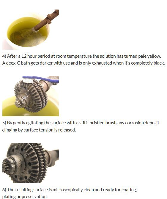 Deox-C je kryštalický, 100% aktívny produkt proti korózii, ktorý je určený na odstraňovanie korózie z ocele, nerezovej ocele a väčšiny železných materiálov. Prípravok sa rozpustí vo vode a vytvorí kúpeľ s výkonnou kvapalinou na odstránenie hrdze. Deox-C je mimoriadne úsporný, napríklad len 1 kg Deox-C vytvorí až 20 litrov silnej kúpele na odstraňovanie hrdze. Dokáže odstrániť aj veľmi ťažkú koróziu, ale je bezpečný pre použitie aj na najjemnejšie predmety. Je vhodný pre všetky predmety, ktoré môžu byť úplne ponorené. Deox-C je neškodný, netoxický a biologicky odbúrateľný.