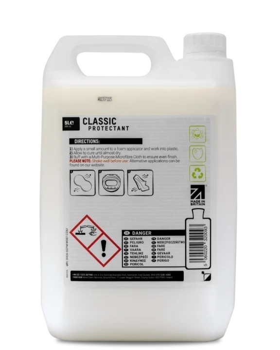 Classic Protectant je emulgovaná zmes silikónov, ktorá dodáva nielen lesk a chráni, ale oživuje vyblednuté plasty. Akonáhle tento produkt uschne, je odolný voči poveternostným vplyvom a ponúka ochranu a výrazné zvýšenie lesku vonkajších a vnútorných plastov, kože a pneumatík. Classic Protectant sa ľahko používa, bol navrhnutý tak, aby sa používal neriedený. Je možné ho ale zriediť aj tak, aby sa lesklý povrch prispôsobil vašim preferenciám.
