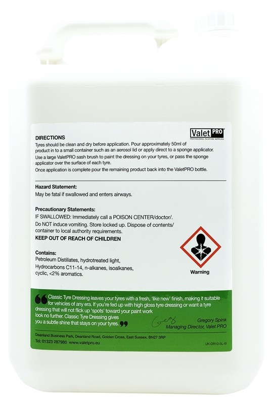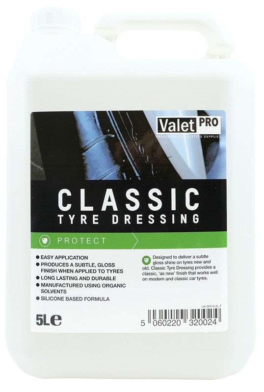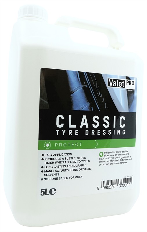 Classic Tyre Dressing je silikónový ošetrujúci prípravok na pneumatiky. Vo ValetPRO použili zmes silikónových rozpúšťadiel s nízkym množstvom prchavých organických zlúčenín (VOC), vytvorili ošetrujúci prípravok na pneumatiky, ktorý zanecháva dokonalú ochrannú vrstvu na pneumatikách. Dodáva čistý lesk, ktorý vydrží. Obsahuje špeciálne silikóny, ktoré dodávajú vysokú odolnosť. Prípravok je vytvorený tak, aby sa ochranná vrstva držala na pneumatikách a nie na lakovanom povrchu.