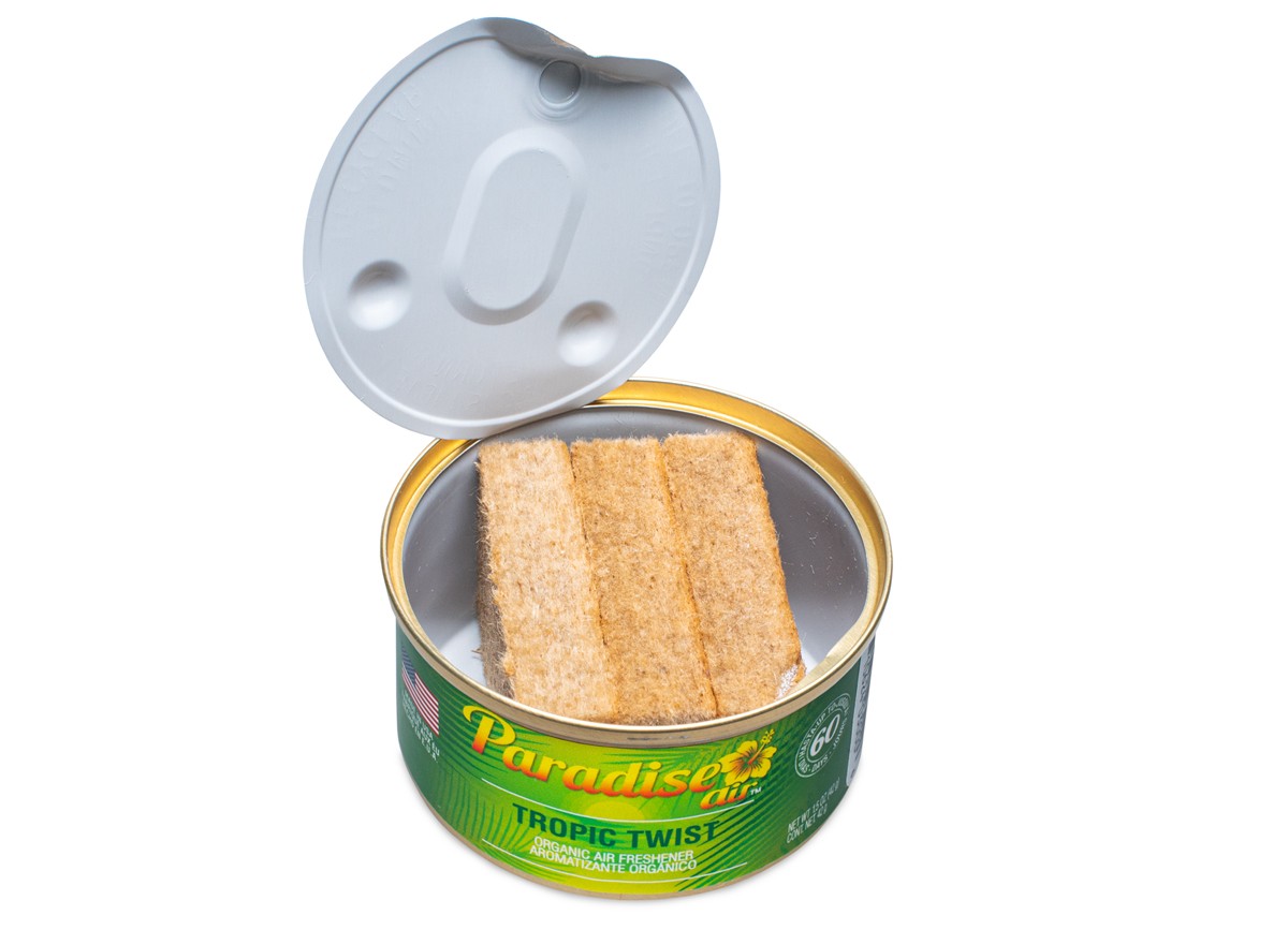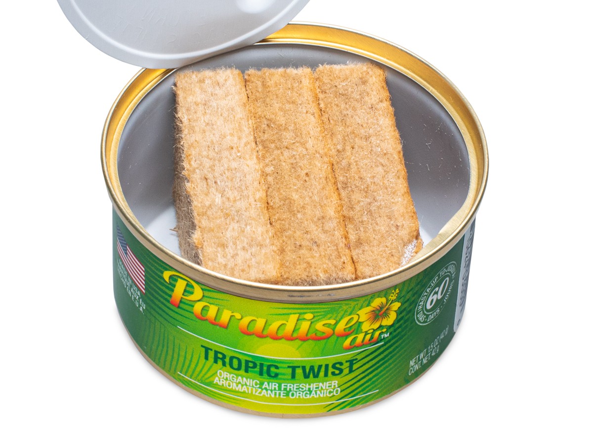 - Každá plechovka vône Paradise Air Organic obsahuje tri bloky lisovaného ľanu napusteného parfumom.
