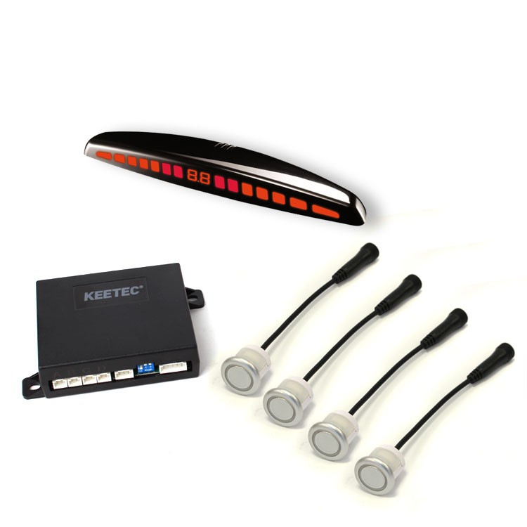 Parkovací asistent KEETEC so 4 čiernymi senzormi a LED displejom so zabudovaným reproduktorom, určený na montáž do vozidiel s kovovým nárazníkom. Systém obsahuje funkciu Antihook (ignoruje ťažné zariadenie vozidla), automatickú identifikáciu chybného snímača a je doplnený o nastavenie citlivosti, funkciu učenia. Súprava obsahuje 4 ks parkovacích senzorov, riadiacu jednotku, LED displej a kabeláž. Napájacie napätie 12 V.