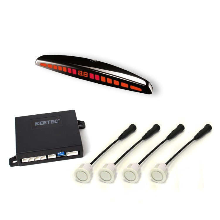Parkovací asistent KEETEC so 4 bielymi senzormi a LED displejom so zabudovaným reproduktorom, určený na montáž do vozidiel s kovovým nárazníkom. Systém obsahuje funkciu Antihook (ignoruje ťažné zariadenie vozidla), automatickú identifikáciu chybného snímača a je doplnený o nastavenie citlivosti, funkciu učenia. Súprava obsahuje 4 ks parkovacích senzorov, riadiacu jednotku, LED displej a kabeláž. Napájacie napätie 12 V.