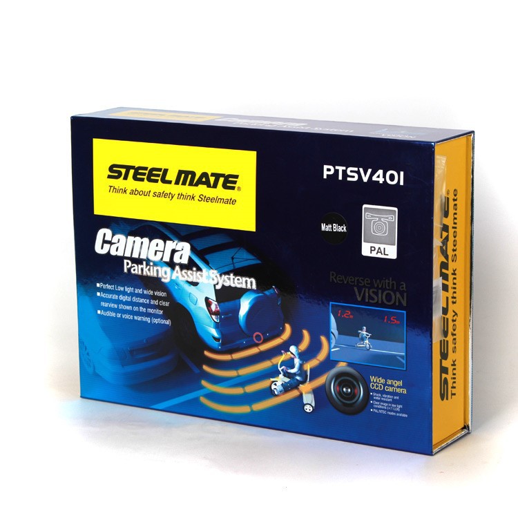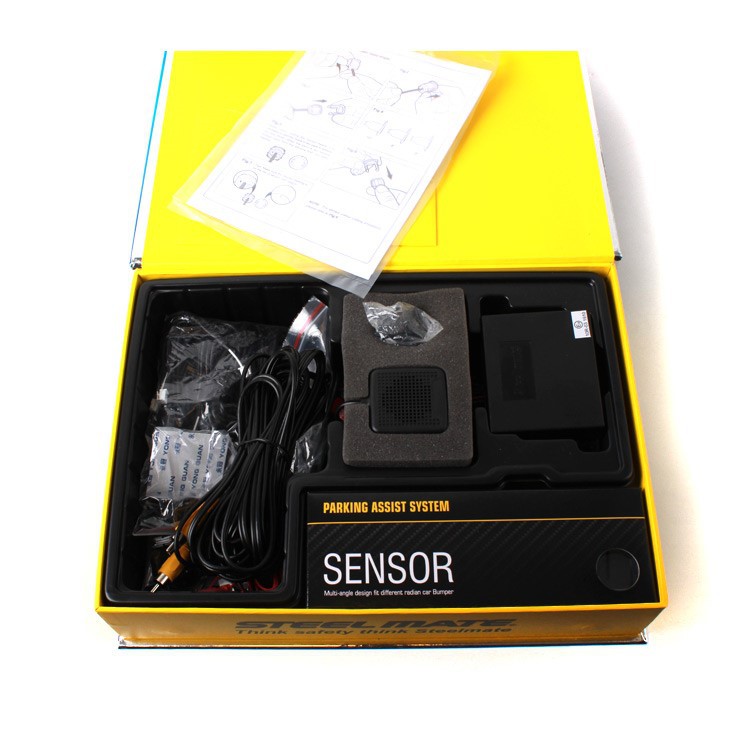 Parkovací asistent STEELMATE s kamerou, so 4 senzormi a AV výstupom na monitor alebo rádio, určený pre inštaláciu do zadného nárazníka vozidla. Systém je doplnený o automatickú identifikáciu poškodeného senzora, obsahuje bzučiak s nastaviteľnou hlasitosťou. Sada obsahuje kameru, 4ks parkovacích senzorov s náklonovým krúžkami, riadiacu jednotku, bzučiak a kabeláž. Napájacie napätie 12V.