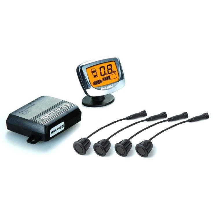Parkovací asistent STEELMATE so 4 snímačmi a bezdrôtovým LCD displejom T s dosahom až 30metrov určený pre inštaláciu do zadného nárazníka vozidla. Displej mení farebné podsvietenie v závislosti od vzdialenosti k prekážke. Čím je prekážka bližšie, tým je frekvencia pípania intenzívnejšia, až nakoniec je tón súvislý a na displeji sa zobrazí-P. Displej bliká striedavo bielym a červeným podsvietením.