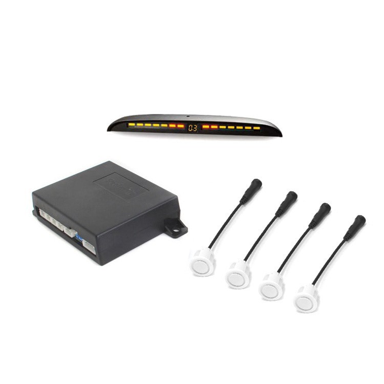 Parkovací asistent STEELMATE so 4 bielymi snímačmi a LED displejom M8 s číselným dvojfarebným ukazovateľom určený pre inštaláciu do zadného nárazníka vozidla. Displej je určený pre montáž na palubnú dosku alebo spätné zrkadlo alebo pre stropnú montáž (sledovanie pomocou odrazu v spätnom zrkadle. Číslice na displeji sú zobrazované zrkadlovo, obrátene po nastavení). Systém obsahuje funkciu Antihook (ignorácia ťažného zariadenia vozidla), automatickú identifikáciu chybného snímača a je doplnený o nové funkcie nastavenia citlivosti a učiaci funkciu. Sada obsahuje 4ks bielych parkovacích snímačov, riadiacu jednotku, displej a kabeláž. Napájacie napätie 12V.