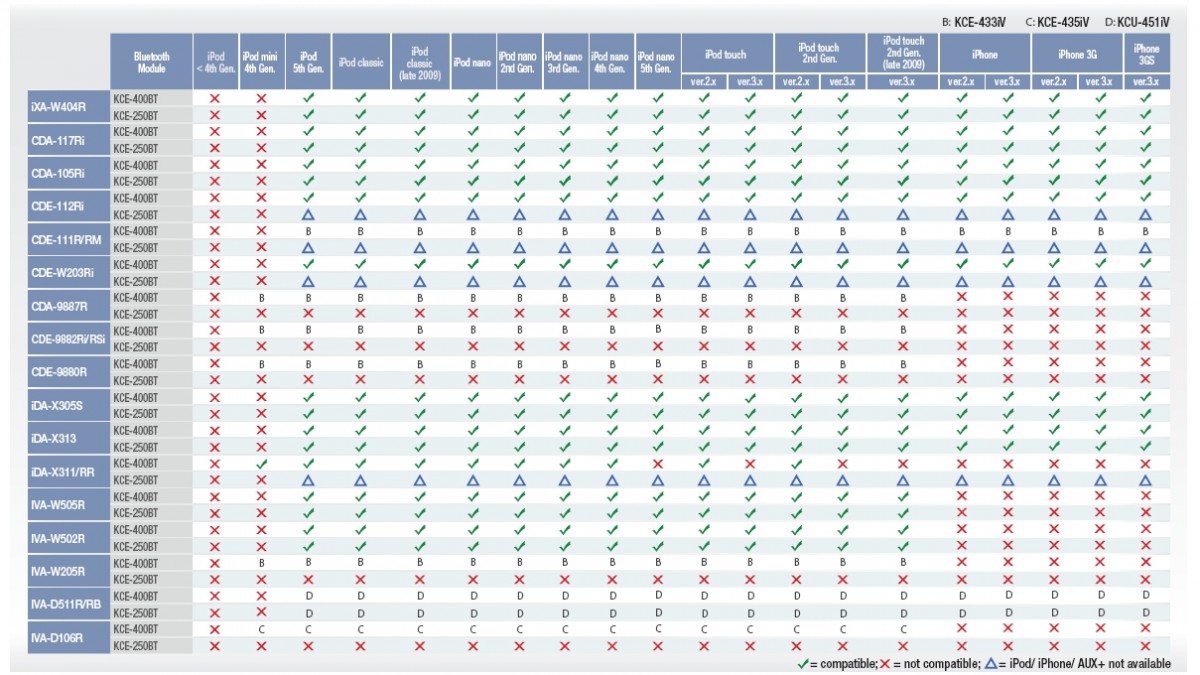 Firmware pre KCE-400BT môže byť aktualizovaný týchto výrobkov: IVA-D511R, IVA-D511RB, IVA-W520R, iXA-W404R, iDA-X305S, iDA-X313, iDA-X311, iDA-X311RR, iDA-X305, iDA-X303, iDA-X301, iDA-X301RR, CDA-105Ri, CDA-117Ri, CDE-W203Ri, CDE-112Ri, CDE-111R, CDE-111R, CDE- 102R, CDE-101R a CDE-101R.
