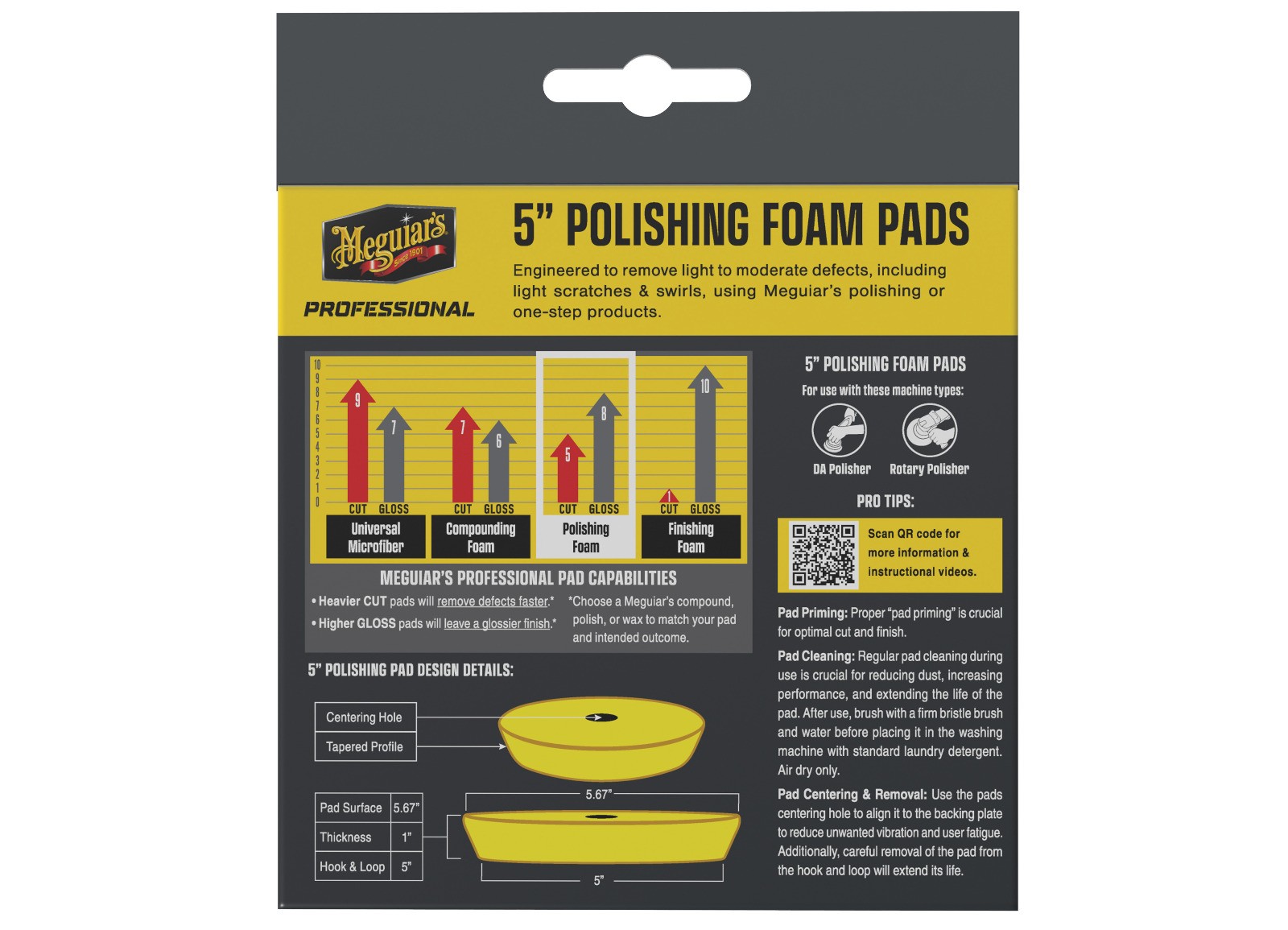 Meguiar’s Professional Polishing Foam Pad sú prémiové penové leštiace kotúče navrhnuté na leštenie a jemnú korekciu laku. Tieto kotúče účinne odstraňujú ľahké až stredné poškodenia laku, ako sú jemné škrabance, oxidácia, hologramy a stopy po kyslom daždi, a zároveň zanechávajú povrch s hladkým, vysokým leskom bez nových defektov. Vďaka pokročilej penovej technológii je dosiahnuté rovnomerného tlaku a stabilného pracovného výkonu. Kotúče sú kompatibilné s rotačnými i orbitálnymi leštičkami, prípadne s adaptérom pre vŕtačku, a sú opakovane použiteľné vďaka možnosti vyprania po použití.