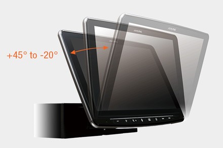 - Nastaviteľný uhol zobrazenia - uhol displeja INE-F904D môžete nastaviť od +45 stupňov do -20 stupňov tak, aby zodpovedal širokému rozsahu uhla palubnej dosky. Po nastavení uhla displeja sa počas inštalácie uzamkne na mieste, aby bol stabilný pri jazde po akomkoľvek teréne a pri zatlačení prsta na displej pre ovládanie jednotky.