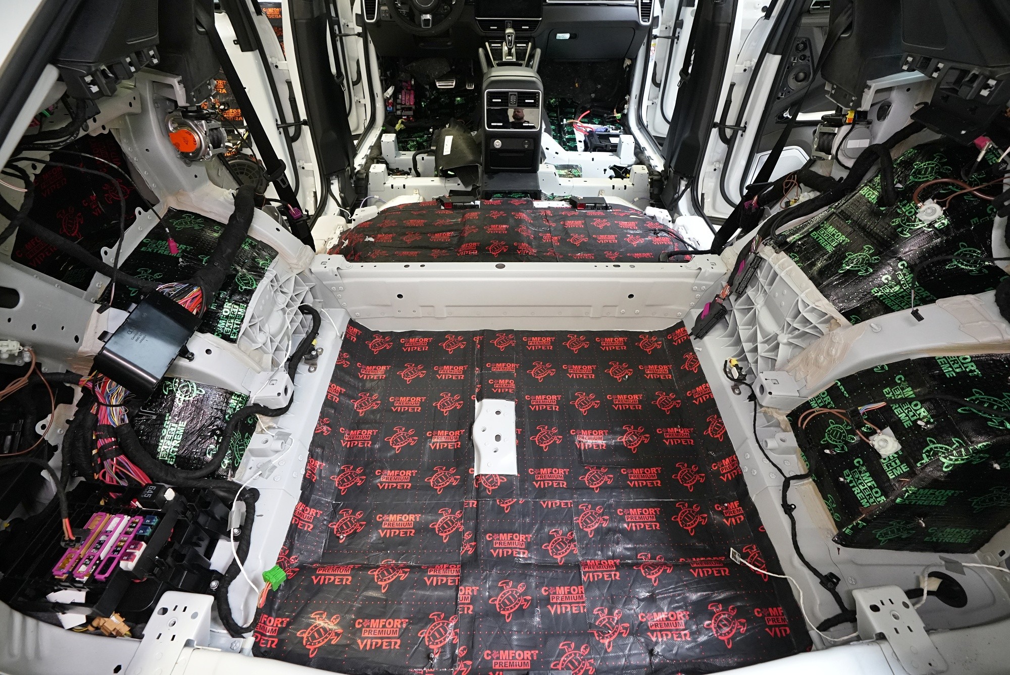 Demontáž interiéru Porsche Cayenne je prvým nevyhnutným krokom, spoločne s predchádzajúcou prípravou všetkých materiálov. Hluková najviac zaťažená je spodná časť automobilu a aby zvuková izolácia mala požadovaný efekt, je nutné pokryť väčšinu karosérie. Preto odstránime všetky čalúnenie, plastové obloženie, sedadlá a ďalšie prvky interiéru. Pred samotnou aplikáciou materiálov povrch dôkladne odmastíme.