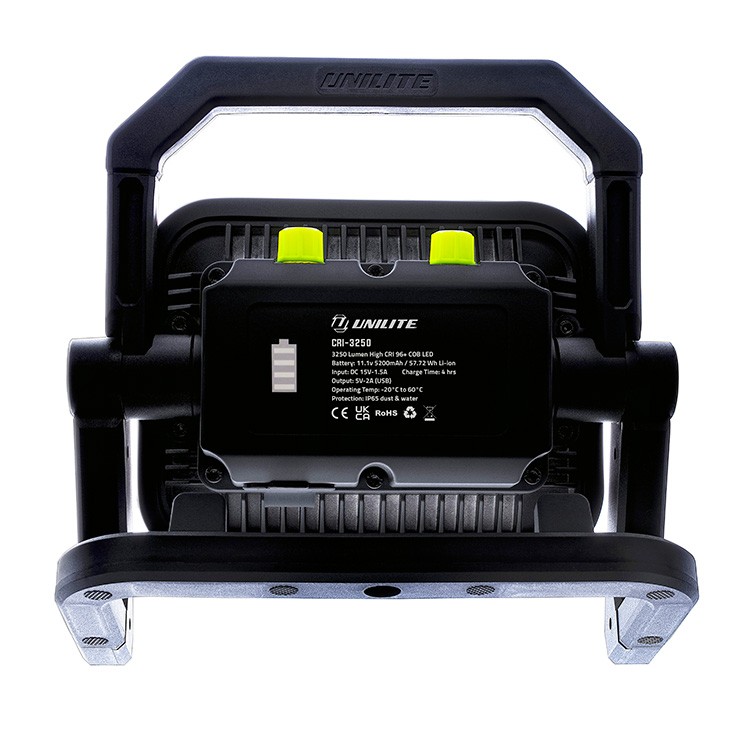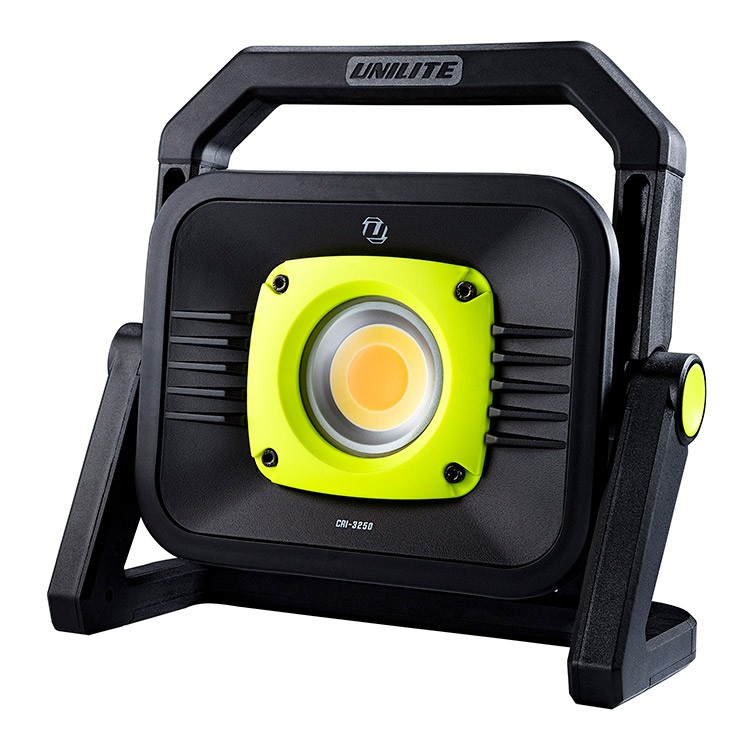 Unilite CRI-3250 je vysoko kvalitné CRI pracovné svetlo, ktoré je súčasťou série CRI dobíjacích LED svetiel Unilite a má schopnosť byť napájané zo siete alebo používané vďaka dobíjacej batérii, + ponúka 2 A powerbanku. CRI-3250 má variabilný výkon s maximom 3250 lúmenov pri najvyššom nastavení a minimálne 200 lúmenov pri najnižšom nastavení z 30 W COB LED, rovnako ako možnosť variabilnej farebnej teploty medzi 2700 K a 6500 K. Index farebného podania (CRI) je meranie schopnosti svetelných zdrojov verne odhaliť skutočnú farbu objektu v porovnaní s prirodzeným zdrojom svetla, ako je slnečné svetlo, a meria sa medzi 0-100. CRI-3250 má vysokú hodnotu CRI 96+, čo znamená, že kvalita svetelného zdroja je extrémne dobrá a zobrazuje farby v skutočnej podobe. Pomáha tiež znižovať namáhanie očí, ktoré môže nižšie svetlo CRI spôsobiť. Svetlo má stojan, ktorý je zastrčený na zadnej strane a je možné ho vytiahnuť a otočiť v rozsahu 170°, aby bolo možné svetlo natočiť v dokonalom smere, a tiež slúži ako silný magnet pre pripevnenie k magnetickým povrchom pre prácu bez použitia rúk. Rukoväť umožňuje jednoduchú prepravu svetelnej jednotky. Po zapnutí sa rozsvieti indikátor stavu batérie, ktorý ukazuje zostávajúcu energiu. Svetlo je vyrobené zo super tvrdej nylonovej a hliníkovej konštrukcie s fluorescenčným žltým stredom.