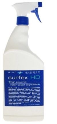 Prázdna fľaša so sprejom, ktorá je určená pre čistič kolies Bilt Hamber Surfex HD. Na fľaši je aj plaketka s popisom produktu Surfex HD. Objem fľaše je 1000 ml a je čiastočne priehľadná. Odporúčame všetkým, ktorí kupujú veľké ekonomické 5 a 25 litrové balenie.