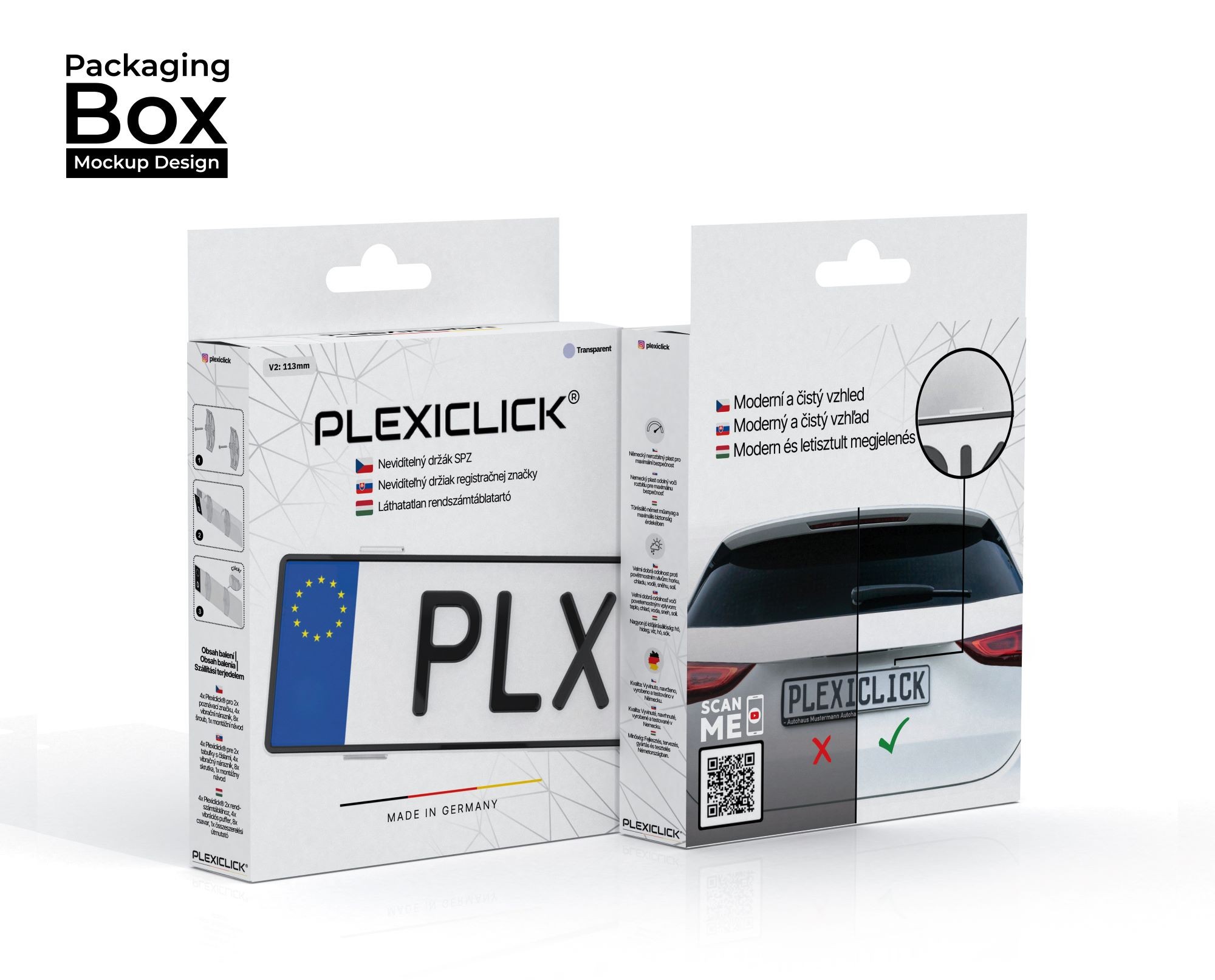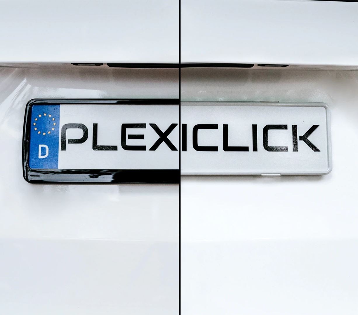 Vadí vám mohutný rámček registračnej značky na vašom aute? Máme pre vás revolučné riešenie vo forme malých, pevných a hlavne takmer neviditeľných plastových držiakov pre uchytenie registračnej značky! Doba širokých, nevzhľadných a čiernych rámčekov pod ŠPZ s nežiadúcou reklamou práve skončila. Na českom trhu môžete konečne zakúpiť špičkové nemecké bezrámové držiaky pod ŠPZ, ktoré sú tou najlepšou a najkvalitnejšou voľbou. Patentovaný klipový systém Plexiclick umožňuje výmenu registračnej značky rýchlo a bez poškodenia. Tento systém bezrámového držiaka registračnej značky je naozaj jedinečný. Registračná značka je extrémne pevne zafixovaná v držiaku, akonáhle sa značka nacvakne. Výrazný zvuk pri nacvaknutí signalizuje, že značka je pevne a bezpečne namontovaná. Značka sa dá najviac kedykoľvek odmontovať. Dodávaný návod k montáži poskytuje všetky informácie rýchlo a prehľadne. Pred kúpou doporučujeme odmerať výšku registračnej značky a podľa toho vybrať správny Plexiclick! Sú dve verzie, Plexiclick V1 Transparent (110 mm) a Plexiclick V2 Transparent (113 mm).Hlavné vlastnosti držiaka Plexiclick V1
