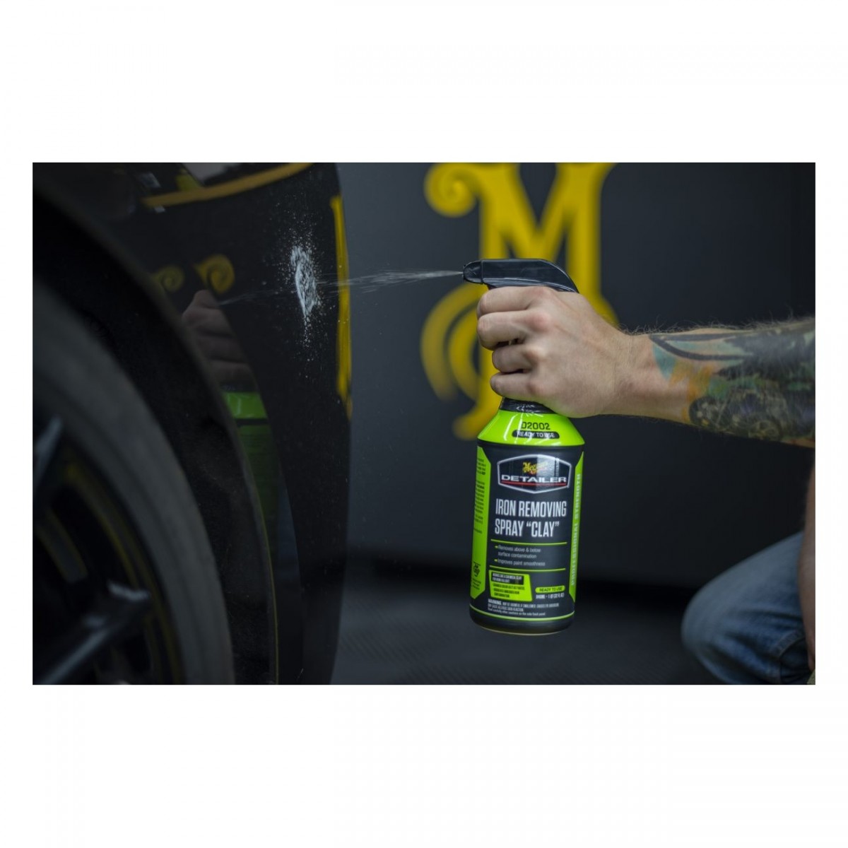 Prípravok na rýchle odstránenie odolných nečistôt na báze železa (brzdový prach, vzdušná hrdza a pod.) a priemyselného spadu. Zároveň uvoľňuje napríklad železitý prach a oxidy železa. Dekontaminácia povrchu uľahčuje a zlepšuje výsledky následného leštenia a zvyšuje výkonnosť a trvanlivosť ochrany laku. Pre dosiahnutie maximálnych výsledkov kombinujte s mechanickou dekontamináciou clayom. Meguiar's Iron Removing Spray Clay obsahuje prímesi, ktoré pri kontakte s nečistotami na báze železa (Fe) sfarbia prípravok do ruda. Tento efekt nie je dôkazom čistiaceho účinku produktu, ale iba indikátorom, či nečistoty na povrchu obsahujú železo. Pokiaľ sú povrchy silne znečistené, avšak bez obsahu železitých nečistôt, prípravok sa nesfarbí, ale stále bude rovnako výborne čistiť povrch od všetkých zvyškov nečistôt.