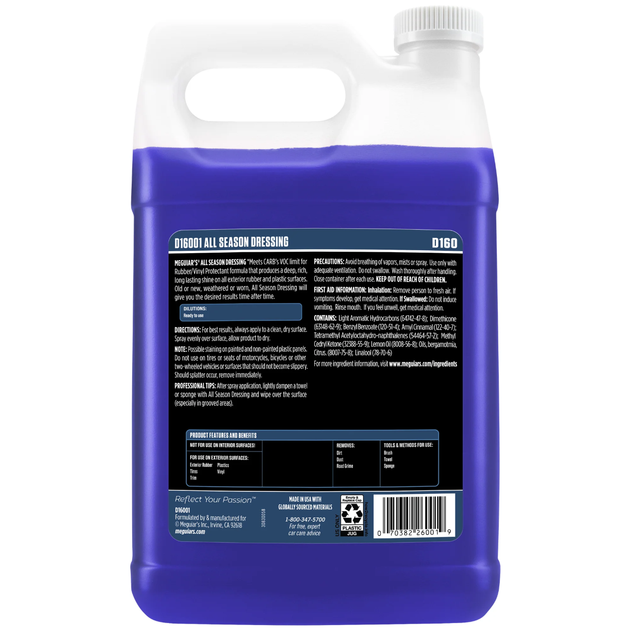Meguiar's All Season Dressing vďaka svojmu zloženiu poskytuje hlboký, bohatý a dlhotrvajúci lesk pre všetky vonkajšie plastové a gumové povrchy. Staré alebo nové, zvetrané alebo opotrebované, všetkým prepožičia Meguiar's All Season Dressing skvelý vzhľad!