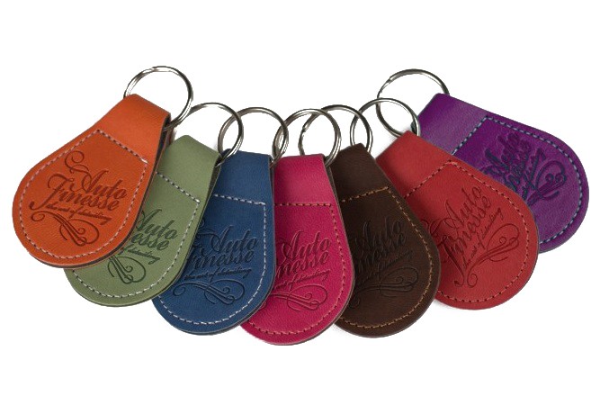 Prívesok na kľúče z pravej kože, fialová farba.