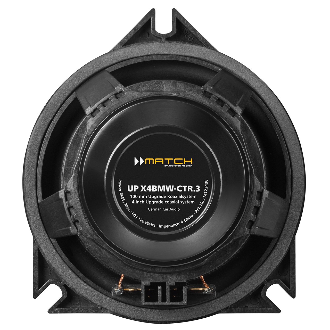 Prémiové vozidlá si zaslúžia prémiový zvuk. Základné nastavenie reproduktorov vo vozidlách BMW v mnohých prípadoch nespĺňa očakávania ambicióznych milovníkov hudby. Pre všetky tieto reproduktorové systémy MATCH na mieru ponúkajú dokonalú alternatívu, ktorá otvára nové horizonty zvuku. Dvojpásmový koaxiálny reproduktor X4BMW-CRT.3 s úchytmi pre dané vozidlo poskytuje oveľa lepšiu presnosť a dynamiku v celom frekvenčnom rozsahu v kombinácii s fantastickým rozlíšením výšok, vďaka 13 mm hodvábnej kalote výškového reproduktora. Jeho úroveň je navyše nastaviteľná v troch krokoch, podľa osobných preferencií každého. Najmä v kombinácii s jedným z DSP zosilňovačov, napr. UP 7BMW špecifickým pre BMW, tieto reproduktory odhaľujú svoj plný potenciál z hľadiska dynamiky.