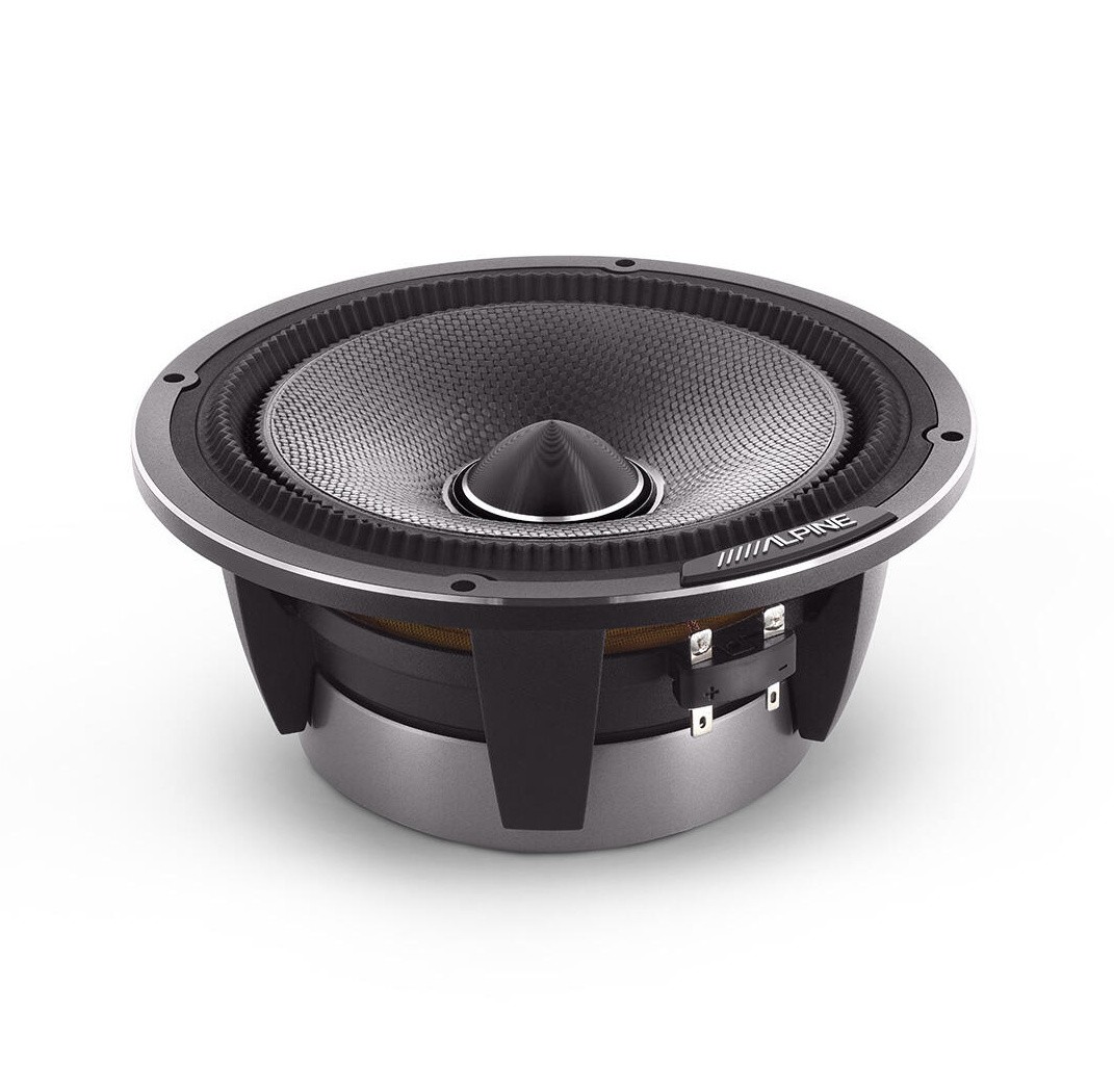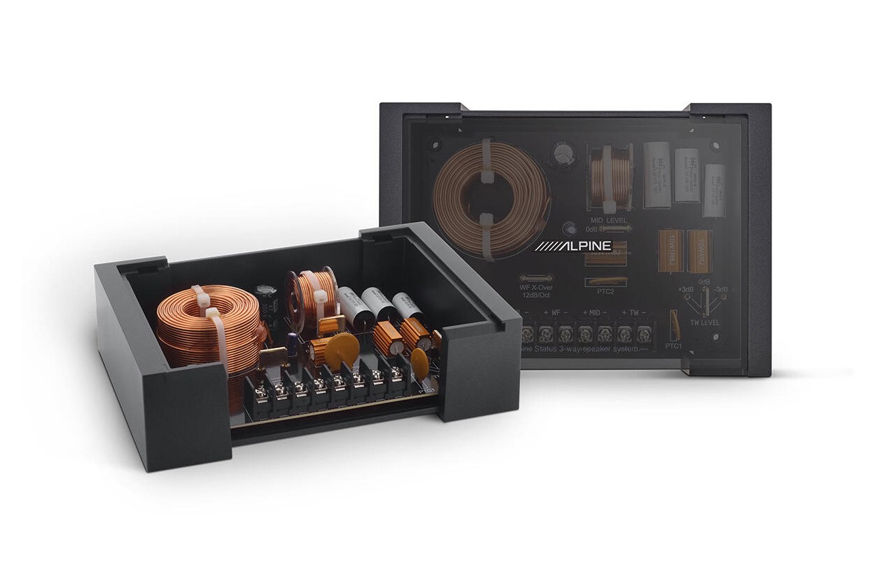 - Audiofilský reproduktor X-Overs - zahrnuté 2-pásmové siete x-over obsahujú ručne vybrané, špičkové komponenty a ponúkajú mnoho možností nastavenia: úroveň výškového reproduktora môžete nastaviť od +3 dB, 0 dB alebo -3 dB a basový reproduktor X-Over môžete nastaviť buď na 12 dB/okt alebo 6 dB/okt. Kryt z dymového akrylu s logom Alpine je možné vysunúť dopredu, aby ste získali prístup k skrutkovacím svorkám a prepojkám.