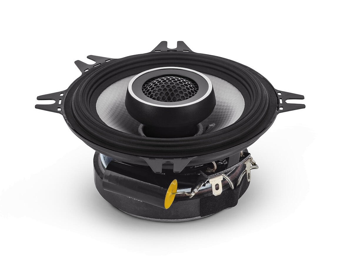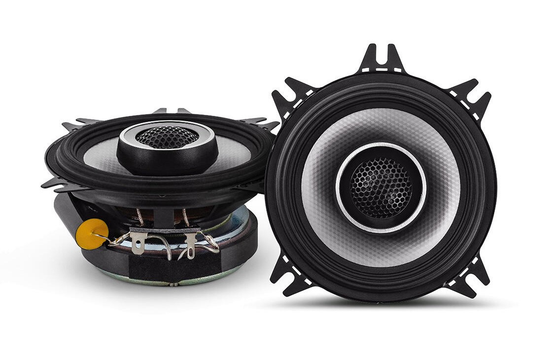 | Typy reproduktorov Koaxiálne reproduktory: Koaxiálne reproduktory sa vyznačujú konštrukciou tzv. Všetko v jednom. Výškový a stredobasový reproduktor sú v jednom koši. Výhodou je jednoduchšia montáž, ale vďaka spojeniu resp. blízkosti pásiem v jednom reproduktore, sa zvyčajne zníži kvalita zvuku. Spravidla uprostred stredobasového reproduktora, je výškový reproduktor, ktorého kmitacia cievka pracuje v druhej vzduchovej medzere spoločného magnatického obvodu. Trojpásmový koaxiálny reproduktor sa skladá zo stredobasového reproduktora, v predu na osobitnom nosníka je stredový reproduktor a samostatný výškový. Komponentné reproduktory: Komponentné reproduktory sa vyznačujú rozdelením na jednotlivé frekvenčné pásma, výškové + stredobasové + popr. basové pásmo. Jednotlivé reproduktory sa dajú umiestniť úplne oddelene, čo má za výsledok lepší zvukový aj akustický prejav. V drvivej väčšine prípadov komponentných reproduktorov je dodávaná aj externá výhybka, ktorá rozdeľuje výškové, stredové / stredobasové a u třípásma aj basové pásmo popr. umožňuje nastavenie decibelovej úrovne u výškového reproduktoru (napr. +2 dB, 0 dB, -2 dB), strmosti (napr. 6dB / okt. 12dB / okt.) či aktívne alebo bi-amp zapojenia. | Koaxiálne 2pásmové |