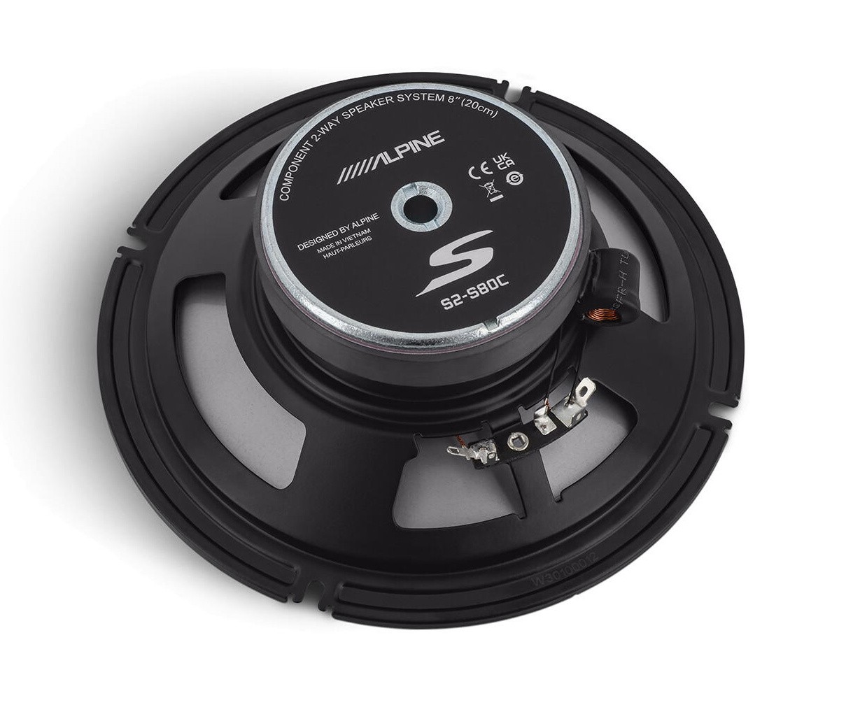 Po novom prepracované a certifikované pre Hi-Res Audio ponúkajú 20 cm (8") komponentné reproduktory novej generácie radu S S2-S80C nový štandard v oblasti základného zvukového výkonu. Do týchto reproduktorov sme vložili špičkové schopnosti vďaka použitiu vysoko účinných materiálov a patentovaných konštrukčných prvkov. Ľahká membrána woofera, vyrobená z kombinácie materiálov polypropylénu, sklených vlákien a sľudy, podáva základný zvuk s vysokým výkonom / nízkym skreslením, ktorý je vyžadovaný pre výkon High-Res Audio. Reproduktory Alpine radu S majú zväčšené rozmery magnetov pre väčší výkon a najlepší výkon v stredobasovom pásme vo svojej kategórii. Membrána basového reproduktora High Amplitude Multi-Roll (HAMR) prináša to najlepšie z basov, pretože umožňuje maximálny pohyb membrány. Výškový reproduktor s kopulkou s priemerom 2,5 cm (1") poskytuje všetky vysokofrekvenčné detaily, ktoré vám u továrenských reproduktorov chýbali. Všetky reproduktory radu S majú široký rozsah montáže do vozidla a obsahujú niekoľko adaptérov a dištančných podložiek. Vďaka použitiu in-line crossoverov je možné tieto reproduktory ľahko a rýchlo nainštalovať aj v domácich podmienkach.
