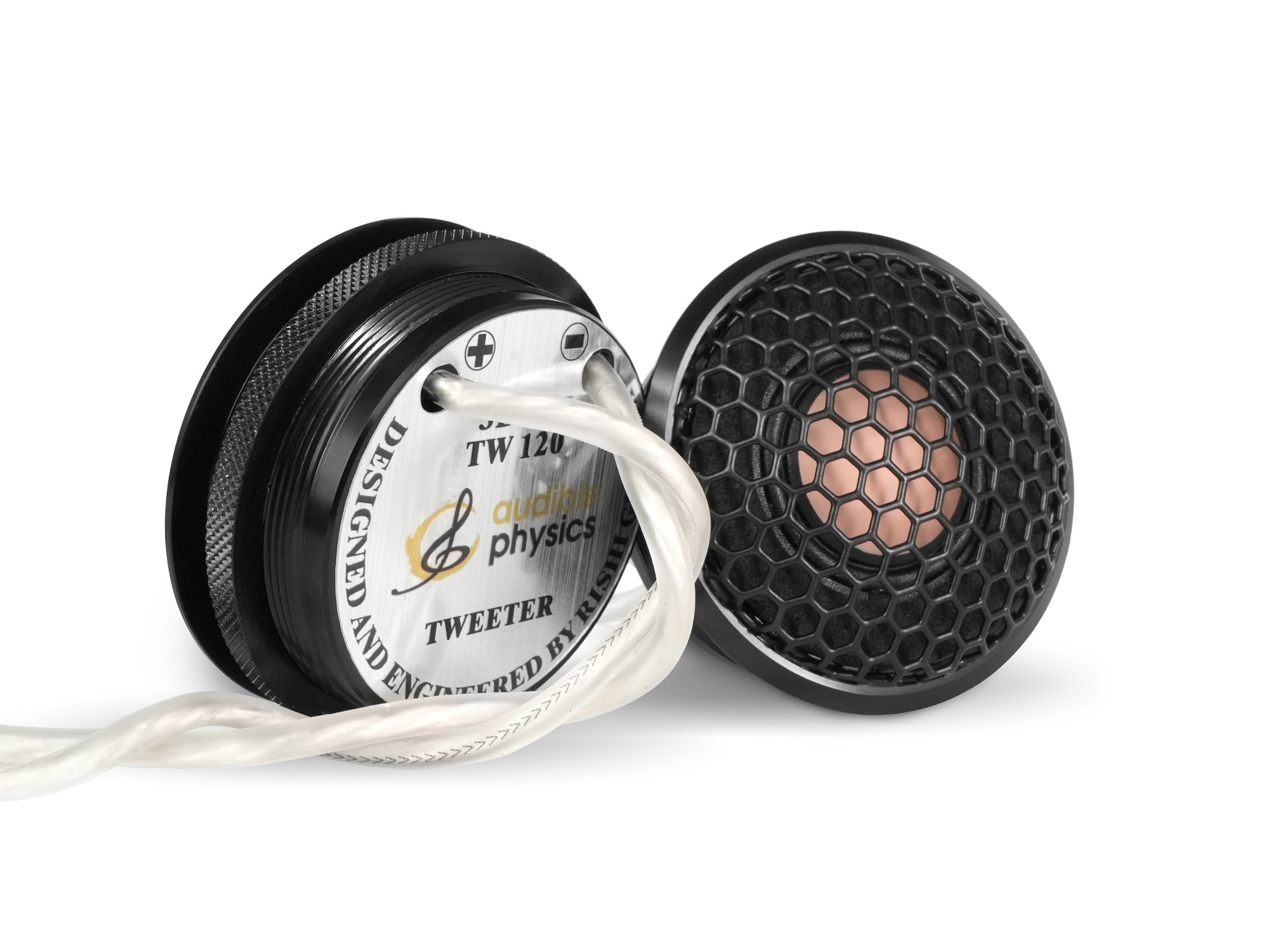 Membrána výškového reproduktora Audible Physics TW 120 je vyrobená z vlastného patentovaného materiálu Matrix Alloy Dome. Ide o zliatinu horčíka a hliníka, ktorá ponúka niekoľko výhod na čele s výnimočnými vysokofrekvenčnými detailmi, analyticky presným zvukom a extrémne hlbokou zvukovou scénou. Táto zliatinová kalota zaujme aj perfektnou linearitou krivky frekvenčnej odozvy aj takmer dokonalou neutralitou. Horčík má navyše skvelé tlmiace vlastnosti a spolu s veľmi tuhým hliníkom v zliatine výrazne znižujú skreslenie a mechanickú deformáciu. Vysoko kvalitný neodymový magnet s priemerom 19 mm je optimalizovaný na dosiahnutie lepšej účinnosti a zlepšenie linearity na zaistenie perfektnej správy napájania a zvýšenie šírky pásma a účinnosti. Nesmieme zabudnúť na extrémne nízku rezonančnú frekvenciu 960 Hz, ktorá umožní schopnosť reprodukovať aj nižšie frekvencie, než býva zvykom u väčšiny konkurenčných výškových reproduktorov. Kalota v medennej farbe nadväzuje svojim dizajnom na membránu stredobasu a opticky tak tvorí dokonale zladený systém. Za zmienku stoja tiež nádherné oceľové domčeky výškového reproduktora navrhnuté na zapustenie. Ich súčasťou sú aj krúžky na rýchle a spoľahlivé upevnenie.