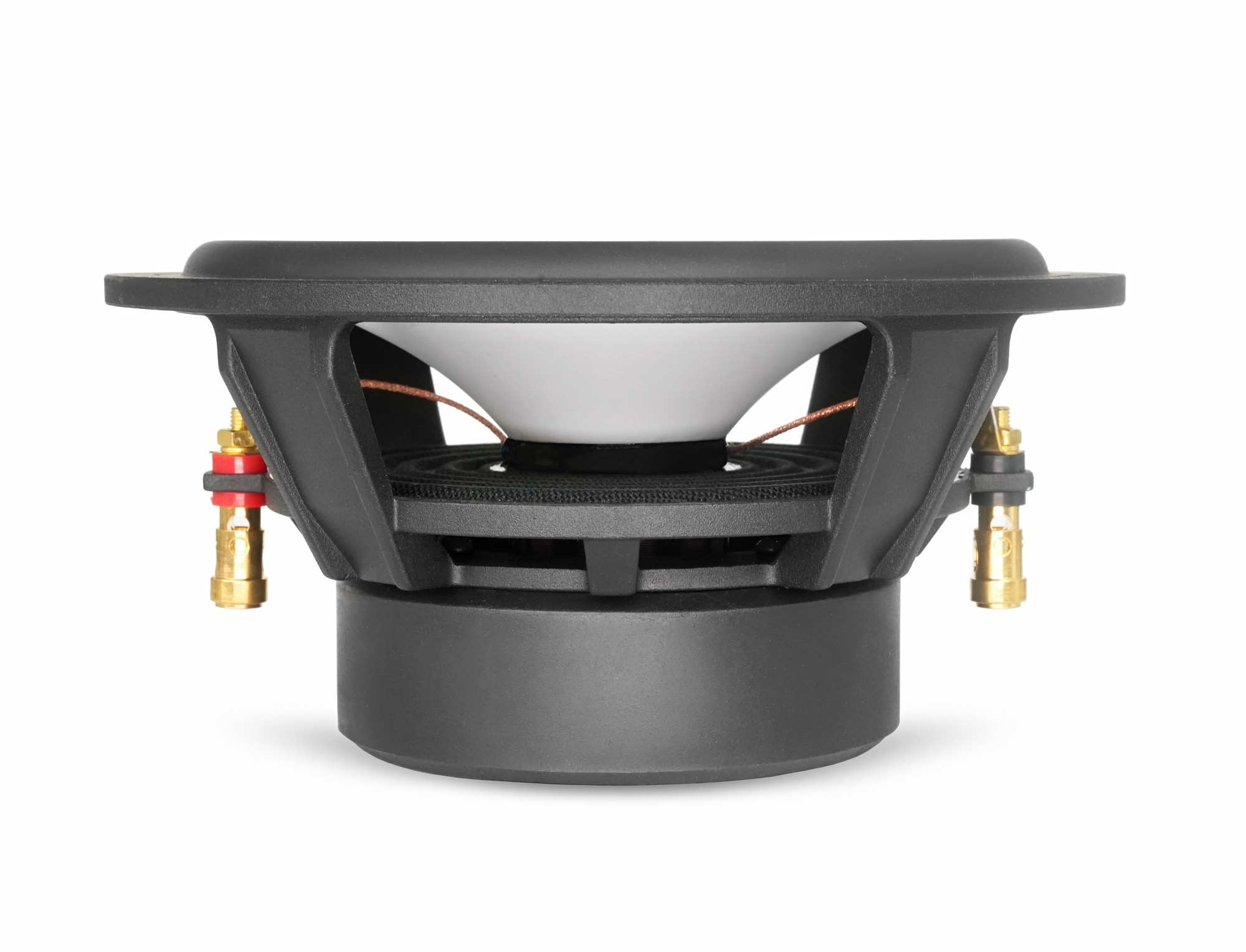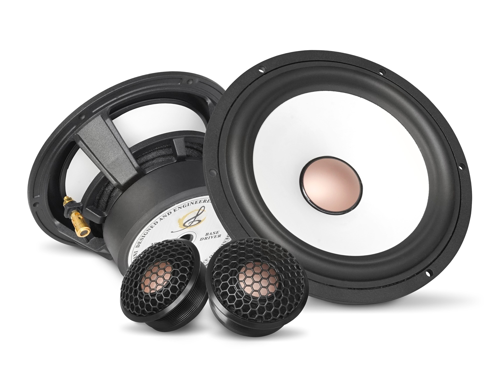 Stredobasové reproduktory Audible Physics BD 635 disponujú klasickým dizajnom Audible Physics s tradičnou bielou membránou a vrchlíkom v medennej farbe. Membrána je vyrobená z materiálu MSP (Magnesium Silicate Polymer), ktorý bol vyvinutý a vyrobený v USA. Tento pokročilý materiál je známy svojou vynikajúcou tuhosťou, veľmi nízkou hmotnosťou a minimálnymi vibráciami, čo umožňuje presnú a prirodzenú reprodukciu zvuku. Medzi ďalšie prednosti patria prakticky nulové vibrácie vznikajúce pohybom membrány, k čomu prispieva aj odolný gumový záves zaisťujúci optimálne tlmenie a priečnu stabilitu. Záves tiež eliminuje pohyby, ktoré by mohli spôsobiť kontakt s 25 mm kmitacou cievkou a robustným keramickým magnetom s rozmermi 90 x 20 mm. Cievka a ďalšie medené komponenty sú vyrobené z najkvalitnejšej medi dovážanej z Japonska a Ruska, ktorá je známa svojou výnimočnou vodivosťou a odolnosťou. Špeciálne navrhnutý liaty kôš reproduktora má hneď niekoľko výhod. Je výnimočne tuhý, eliminuje vibrácie a nedeformuje sa tak pri pohybe membrány, ako to býva v prípade klasických oceľových košov. Zároveň neznižuje magnetické pole a výrazne účinnejšie odvádza teplo z kmitacej cievky. Na koši zaujmú aj masívne káblové terminály, ktoré sme zvyknutí vídať skôr na klasických subwooferoch.
