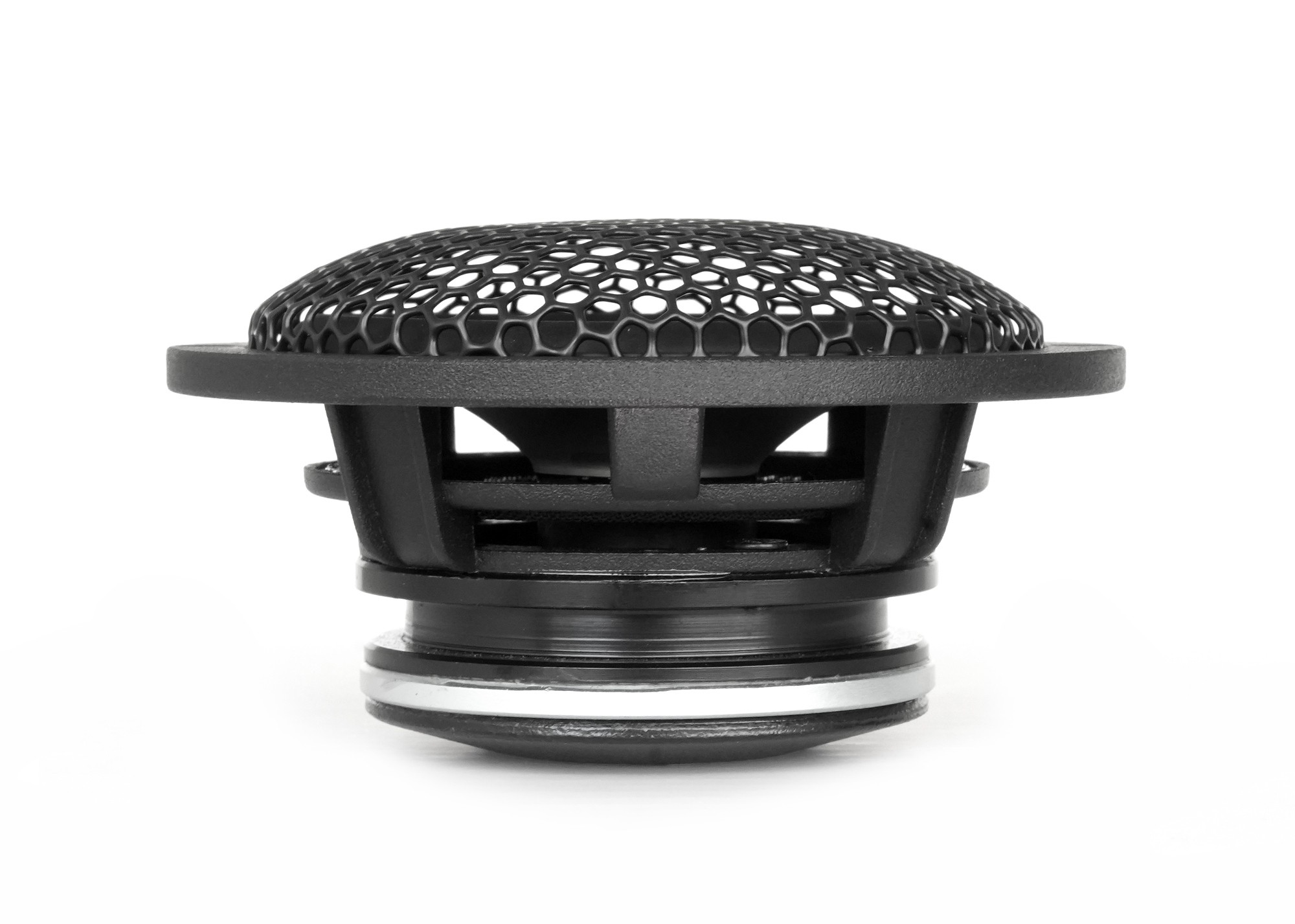 | Typy reproduktorov Koaxiálne reproduktory: Koaxiálne reproduktory sa vyznačujú konštrukciou tzv. Všetko v jednom. Výškový a stredobasový reproduktor sú v jednom koši. Výhodou je jednoduchšia montáž, ale vďaka spojeniu resp. blízkosti pásiem v jednom reproduktore, sa zvyčajne zníži kvalita zvuku. Spravidla uprostred stredobasového reproduktora, je výškový reproduktor, ktorého kmitacia cievka pracuje v druhej vzduchovej medzere spoločného magnatického obvodu. Trojpásmový koaxiálny reproduktor sa skladá zo stredobasového reproduktora, v predu na osobitnom nosníka je stredový reproduktor a samostatný výškový. Komponentné reproduktory: Komponentné reproduktory sa vyznačujú rozdelením na jednotlivé frekvenčné pásma, výškové + stredobasové + popr. basové pásmo. Jednotlivé reproduktory sa dajú umiestniť úplne oddelene, čo má za výsledok lepší zvukový aj akustický prejav. V drvivej väčšine prípadov komponentných reproduktorov je dodávaná aj externá výhybka, ktorá rozdeľuje výškové, stredové / stredobasové a u třípásma aj basové pásmo popr. umožňuje nastavenie decibelovej úrovne u výškového reproduktoru (napr. +2 dB, 0 dB, -2 dB), strmosti (napr. 6dB / okt. 12dB / okt.) či aktívne alebo bi-amp zapojenia. | Stredové |