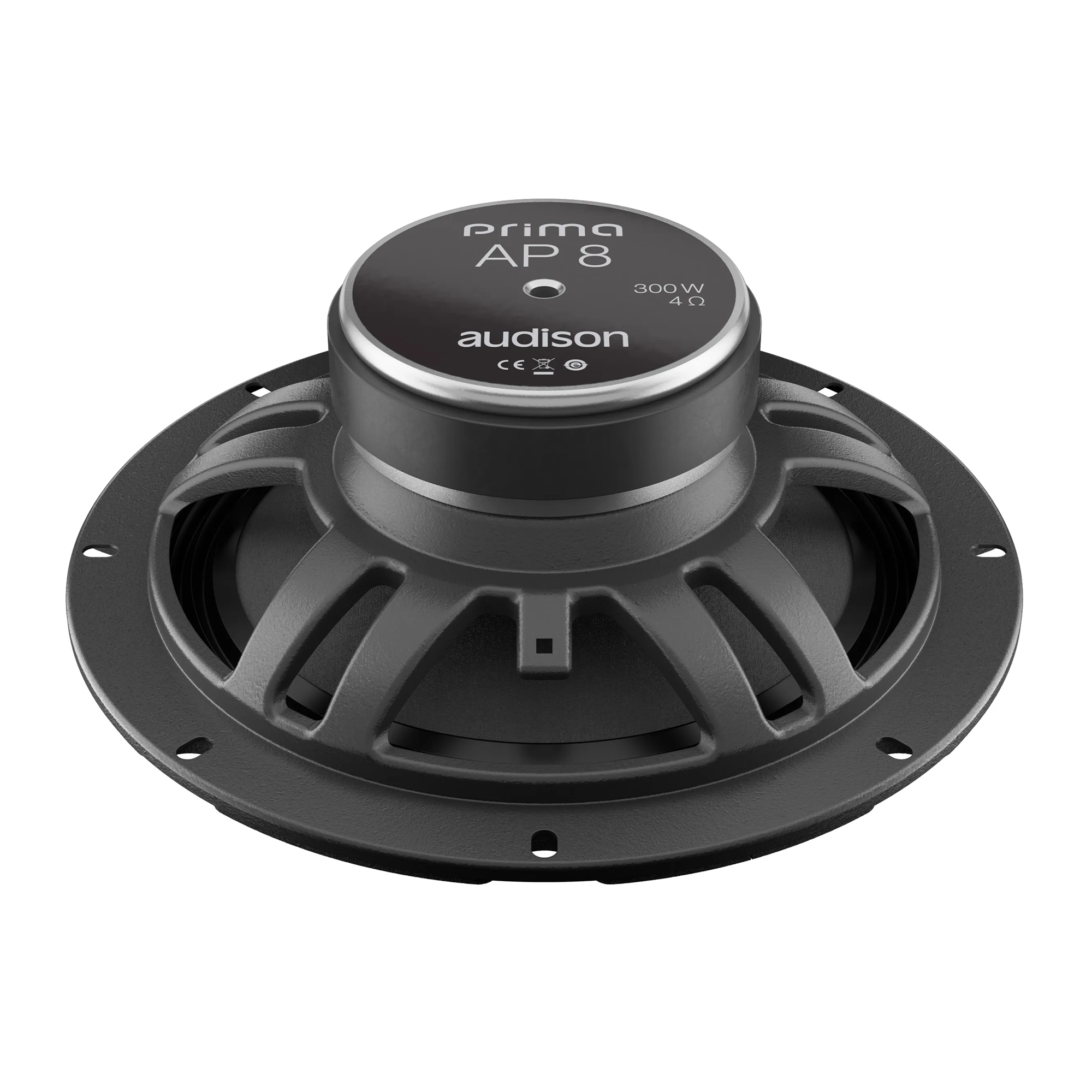 Stredobasové reproduktory Audison AP 8 sú vybavené 32 mm medenou cievkou pre maximálnu výkonnosť. Papierová membrána s vodoodpudivým nástrekom bola vyvinutá pomocou simulačnej technológie FEM (Finite Element Method). Znížená montážna hĺbka umožňuje jednoduchú inštaláciu do najrôznejších umiestnení. Kompaktný kôš reproduktora je chránený náterom proti poškriabaniu. Vďaka terminálu pre rýchle zapojenie je montáž časovo nenáročná a vysoko flexibilná. Terminál je vybavený teplotne odolným plastovým krytom, ktorý ho chráni pred skratom.