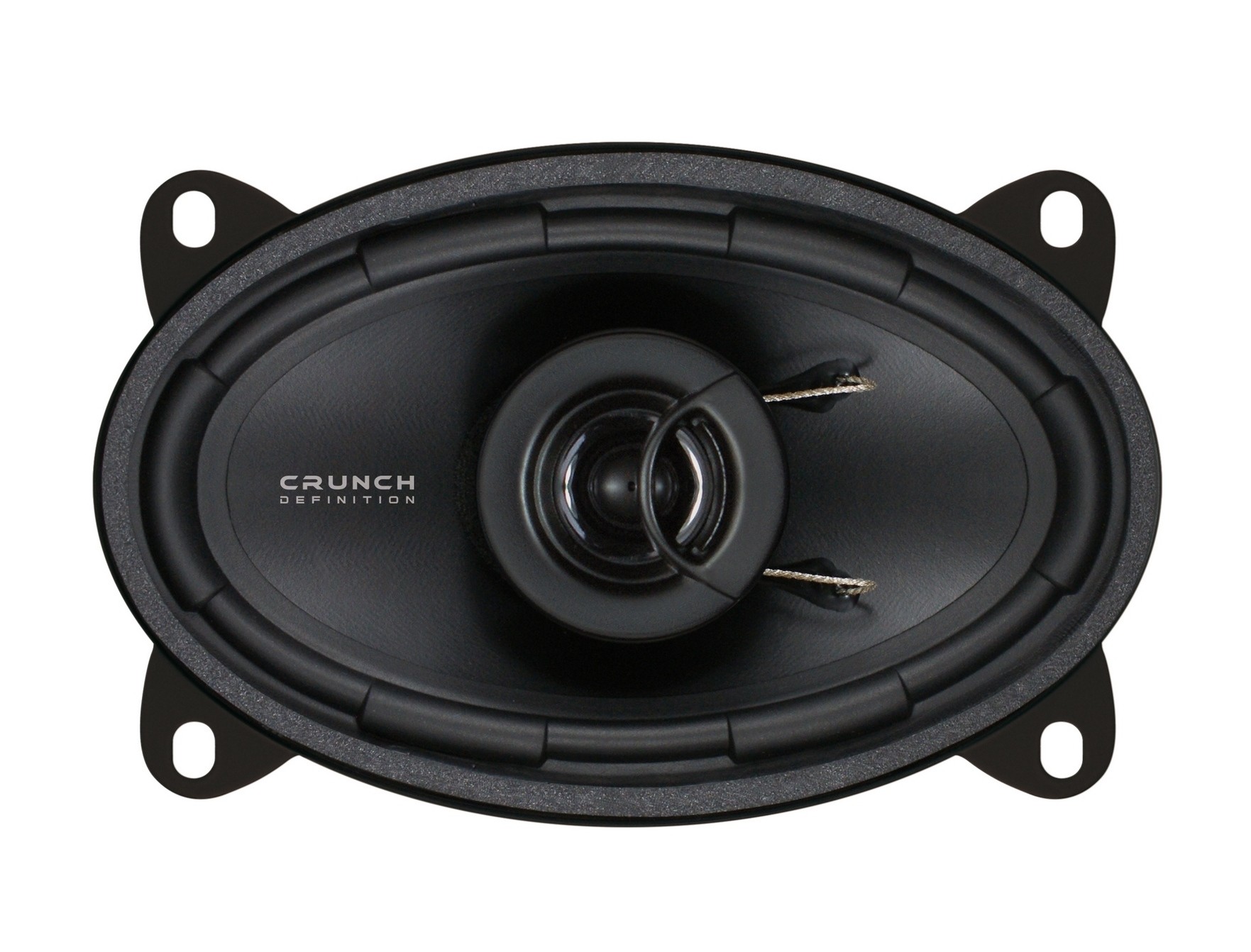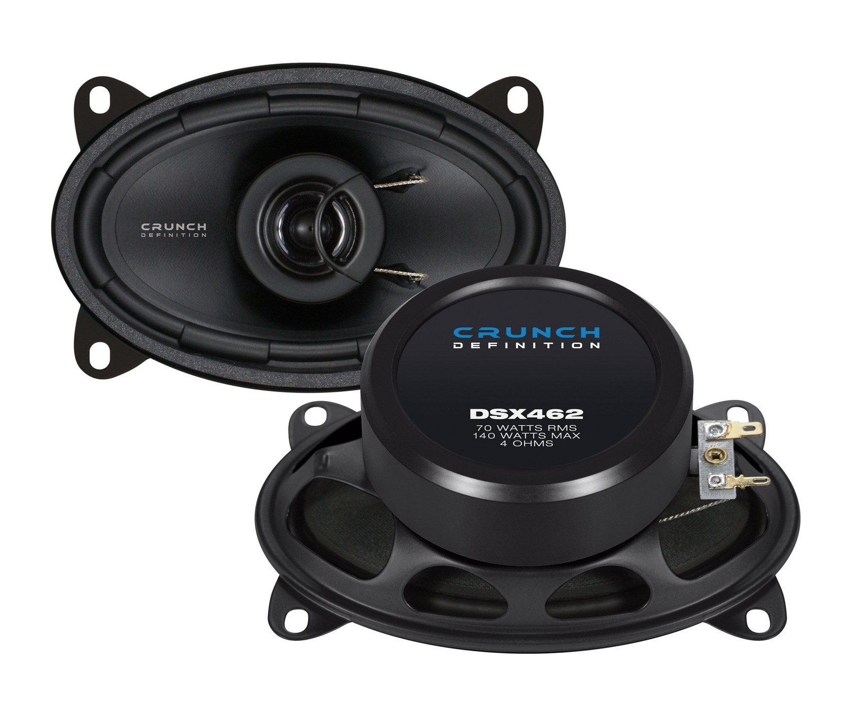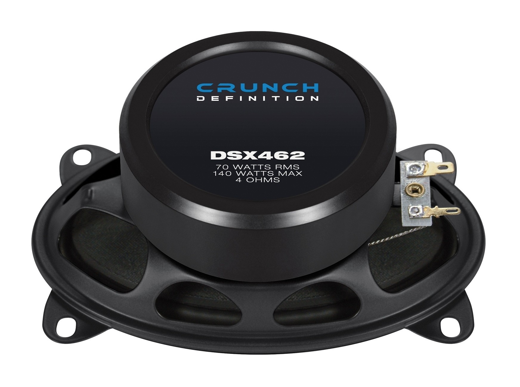 Crunch DSX462 sú koaxiálne reproduktory v prevedení 4 × 6", určené predovšetkým pre vozidlá so špecifickými továrenskými inštalačnými otvormi, kde nie je možné bez úprav použiť bežné okrúhle reproduktory štandardných rozmerov. Predstavujú praktické riešenie pre priame nahradenie sériových meničov bez potreby zložitých adaptérov alebo zásahov do konštrukcie dverí. Stredobasový menič využíva polypropylénovú membránu, 25 mm kmitaciu cievku a pevný oceľový kôš, ktorý zaisťuje dostatočnú tuhosť konštrukcie aj pri vyššom zaťažení. O výškové pásmo sa stará 13 mm výškový reproduktor s mylarovou kalotou, ktorý prináša čistý a zreteľný prejav vo vyšších frekvenciách. Séria DSX je navrhnutá ako cenovo dostupné a konštrukčne robustné riešenie pre upgrade továrneho ozvučenia. Vďaka silným feritovým magnetom, stabilnej mechanickej konštrukcii a vyváženému naladeniu ponúka výrazne lepší zvukový prejav v porovnaní so sériovými reproduktormi pri zachovaní jednoduchej inštalácie a dlhodobej spoľahlivosti.