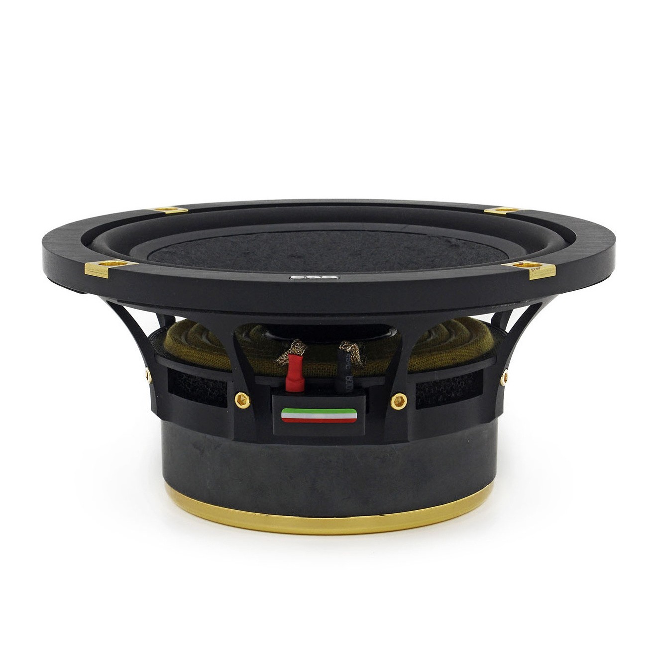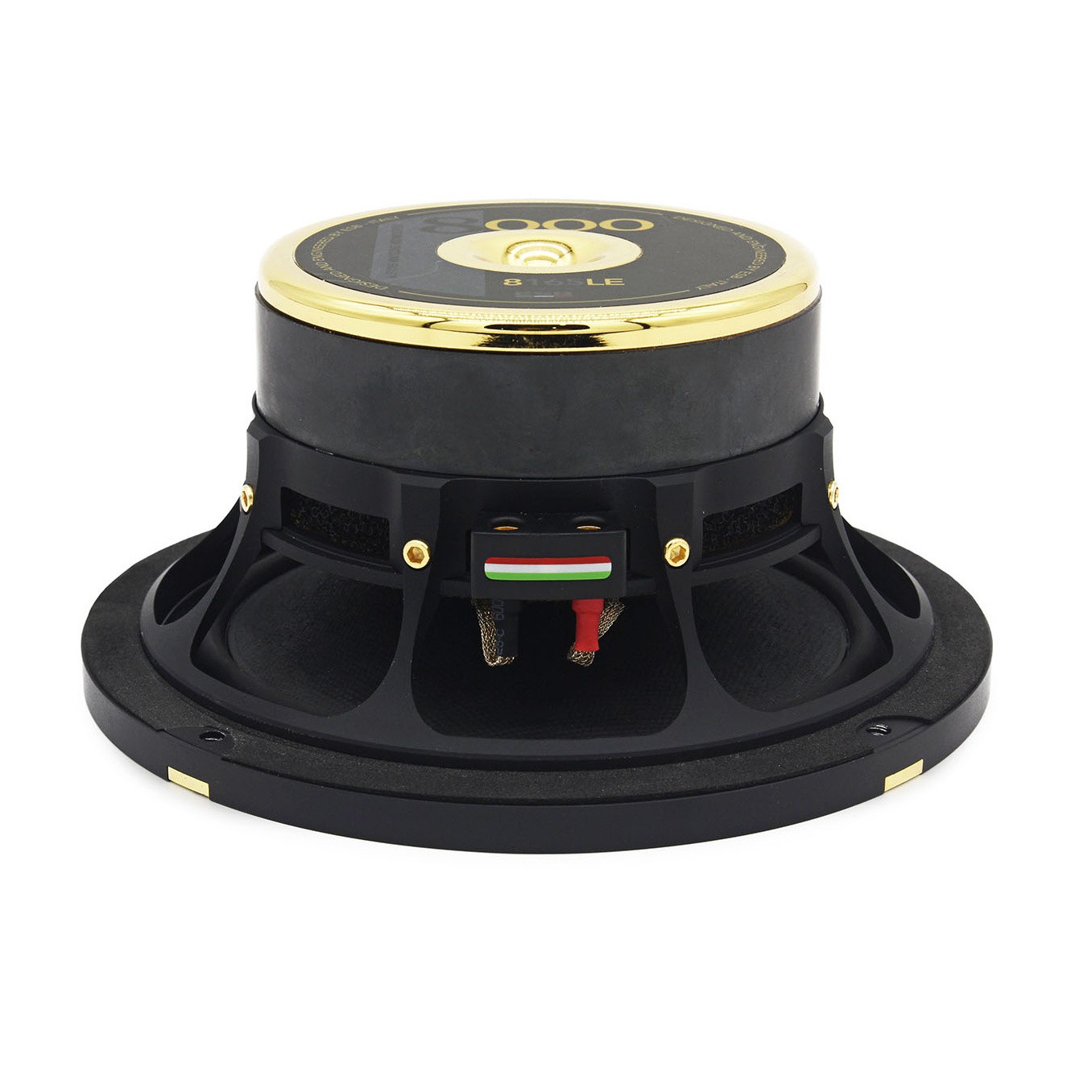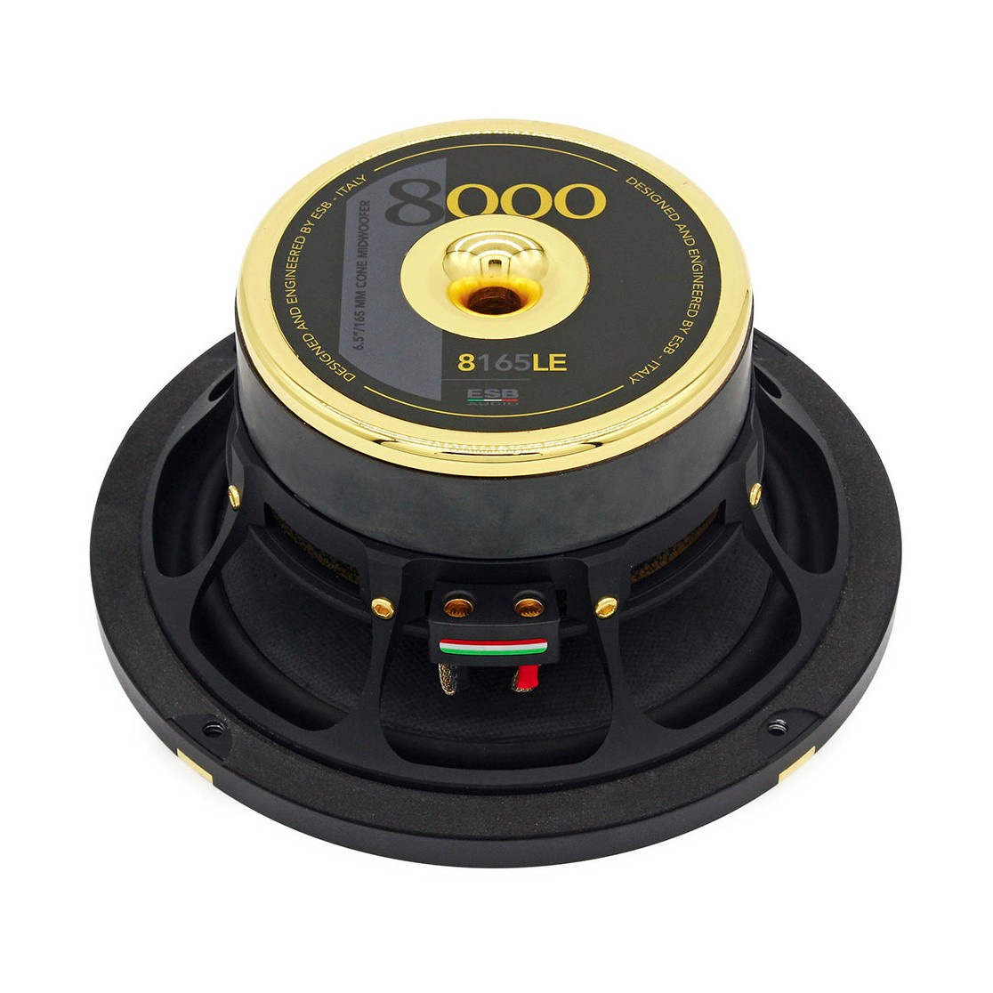 Snáď prvé, čo si ihneď všimnete, je úplne výnimočný vzhľad a spracovanie stredobasových reproduktorov. Kôš vyrobený z hliníkovej zliatiny je kompletne opracovaný numerickým riadením na CNC. Vďaka tomu je štruktúra koša veľmi tuhá a s prakticky nulovými toleranciami v prospech konzistentného výkonu a maximálneho prenosu energie z kmitacej cievky do membrány. A to so zvýšením účinnosti v nízkom rozsahu a absenciou rezonancií v strednom a vysokom rozsahu. Membrána z nestlačeného papiera, rovnako ako protiprachový kryt, predstavujú najlepší kompromis medzi tlmením a tuhosťou pre extrémne prirodzený zvuk bez zafarbenia alebo zmien. Vodoodpudivá úprava je taktiež vhodná pre aplikácie v drsnom prostredí. Veľký a vysoko kvalitný vinutý magnet (Y-35) zaručuje prebytok energie, vďaka ktorému sú špičky výchylky ľahko reprodukovateľné z basového reproduktora. Aj pri vysokých výchylkách pracuje cievka ticho a vždy vo svojom magnetickom poli. Starostlivé štúdium podporené analýzou FEM umožnilo navrhnúť kovové časti magnetu tak, aby sa maximalizoval tok presne okolo pohyblivej cievky a aby bol lineárny po celú dobu výchylky. Vetranie je zaistené veľkým otvorom v spodnej časti, kde jeho tvar znižuje hluk z prípadných turbulencií na nepočuteľnú úroveň. Kmitacia cievka s veľkým priemerom využíva hliníkovú podperu pre lepší rozptyl teploty. Ďalej je celá kmitacia cievka vystavená vonkajšiemu vzduchu cez veľké štrbiny v koši (chránené prachovou hubkou). Pri reproduktoroch série 8000 hrá každý detail dôležitú úlohu a preto sa v ESB zamerali aj na exkluzívnu dizajnovú svorku, ktorá akceptuje káble s veľkým prierezom.