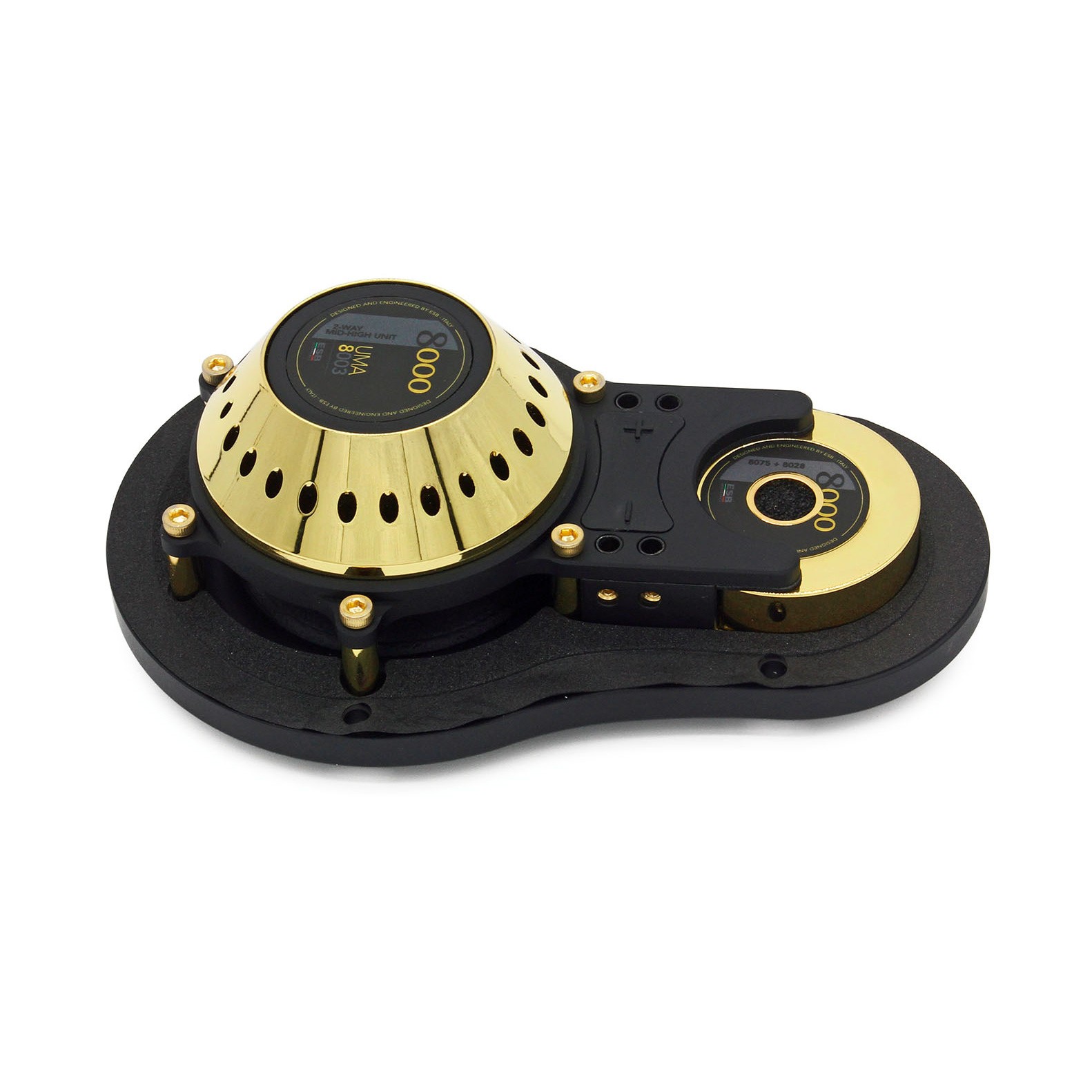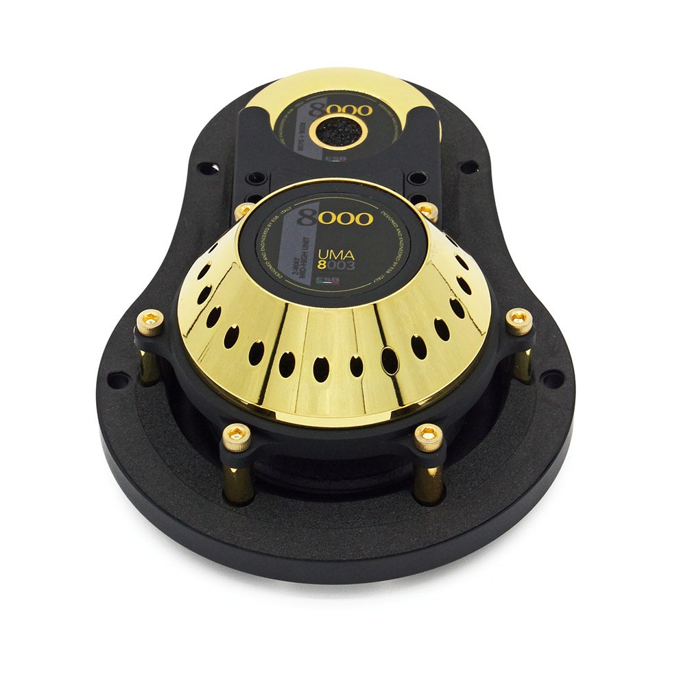 Modelový rad 8000 (Ottomila) môže byť považovaný za priameho dediča dnes už legendárneho radu 7000 pre domáce ozvučenie. Cieľom bolo obnoviť tento výnimočný rad reproduktorov za pomoci najnovších technológií a použitia tých najlepších materiálov, ktoré sú v dnešnej dobe k dispozícii. A to s ohľadom na všestrannosť inštalácie. Kľúčom k vývoju tohto typu systému v automobiloch bolo maximálne využitie nevšednej muzikálnosti vtedajších reproduktorov. Pri rade 8000 bolo o každý detail postarané s najväčšou možnou starostlivosťou, od výberu materiálov, konštrukcie a povrchovej úpravy košov až po ventilačné systémy magnetov a cievok. V ESB zlepšili všetko, čo bolo doteraz považované za nemožné a sú presvedčení, že položili základ pre ďalšie desaťročie úspechu. No posúďte sami. Na prvý pohľad zaujme luxusný dizajn s kovovými prvkami zlatej farby, kôš z hliníkovej zliatiny, tvrdená papierová membrána pre čo najrealistickejšie podanie zvuku alebo špičkové výškové reproduktory zo zliatiny hliníka a medi s membránou z exkluzívneho materiálu Torcon®. Prekvapí aj úplne luxusné balenie z kombinácie dreva a skla. Súhrne ide o nekompromisné high-end reproduktory, ktoré uspokoja aj tých najnáročnejších klientov. K dostaniu dvojpásmový aj dva trojpásmové systémy vhodné pre aktívne zapojenie na zosilňovač a DSP procesor. Táto sada obsahuje unikátnu UMA jednotku, ktorej súčasťou je ako výškový, tak stredový reproduktor. Tento špeciálny a exkluzívny komponentný menič je konceptom zrodeným už v 70. rokoch a jeho cieľom je sústrediť stredné a výškové reproduktory do jediného virtuálneho bodu. To minimalizuje fázové oneskorenia a nepravidelnosti v bode prechodu. Reproduktor sa skladá z 28 mm výškového reproduktora 75 mm stredotónového reproduktora s odlišným prachovým krytom, aby mal stredotónovú funkciu (nie širokopásmovú) a nerušil frekvenciu výškového reproduktora.