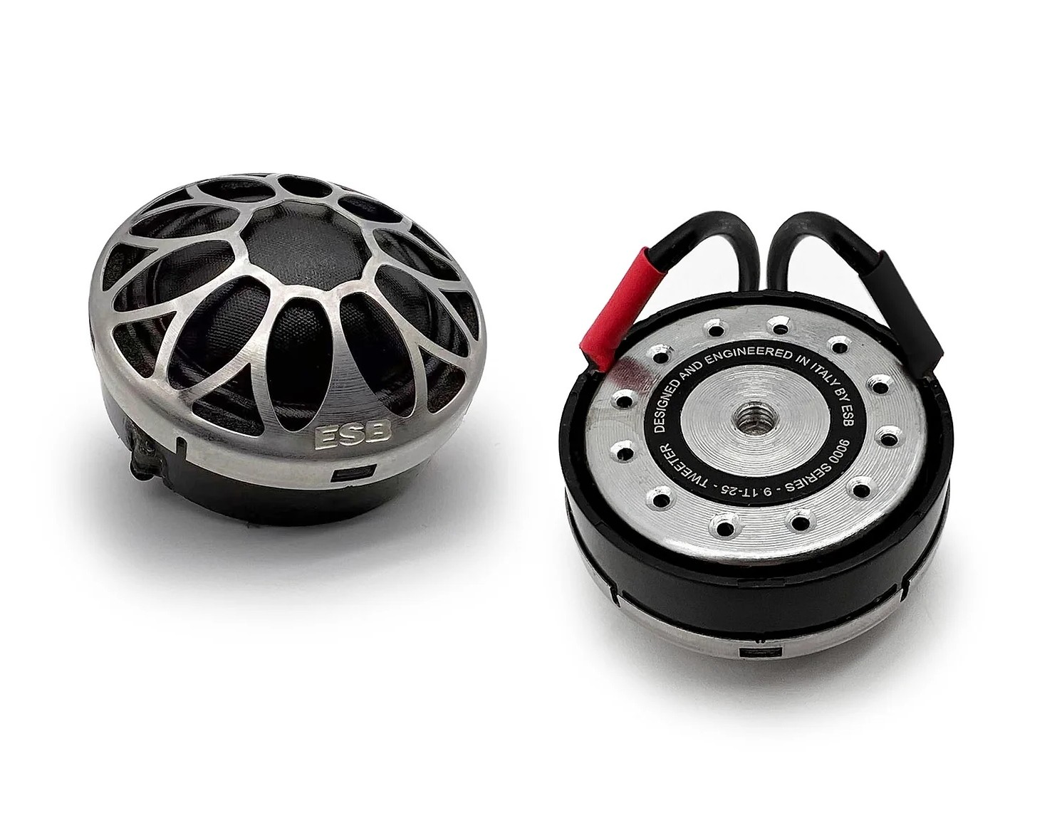 ESB Audio 9.1T-25 predstavujú jednu z dvoch možností výškových reproduktorov radu 9000. Jednotlivé modely sa líšia priemerom kaloty a niekoľkými ďalšími parametrami i technológiami, na druhú stranu majú veľa technologických aj dizajnových riešení spoločných. Pravdepodobne si najskôr všimnete krásny dizajn výškového reproduktora. Nejde však iba o vyjadrenie talianskej estetiky, ale má svoje opodstatnenie. Tento dizajn umožňuje dosiahnutie dokonalej rozmerovej stability a zaisťuje perfektné spojenie všetkých dielov s veľmi nízkymi toleranciami, čo znižuje skreslenie a zlepšuje výkon. Membrána je vyrobená z ľahkého polopriehľadného hodvábu, ktorý je dokonalou kombináciou ľahkosti a pevnosti a v dnešnej dobe je pravdepodobne tým najvhodnejším materiálom pre extrémne realistickú hudobnú reprodukciu. Kalota je impregnovaná živicou s integrovaným odpružením a je vyrobená z jedného kusu, ktorý zahŕňa aj zavesenie. To výrazne znižuje hmotnosť a umožňuje výškovému reproduktoru dosiahnuť veľmi vysoké frekvencie. Absencia spojov zabraňuje rozpadu a rôznym vibračným javom. Vysoko kvalitný neodymový magnet výškového reproduktora zaisťuje obrovskú magnetickú silu aj po hodinách používania, kedy bude výškový reproduktor horúci. Kmitacia cievka je veľmi ľahká a môže pracovať ľahko nad 20 kHz a zaručuje rýchlu prechodovú odozvu a veľmi prirodzený zvuk. Za zmienku stojí aj rad kalibrovaných axiálnych otvorov, ktorý spája vnútornú časť výškového reproduktora so zadnou komorou získanou spojením krytu konektora. To pomáha znížiť rezonančnú frekvenciu, zlepšuje ventiláciu a znižuje impedančnú špičku, takže odozva je dlhšia a lineárnejšia.