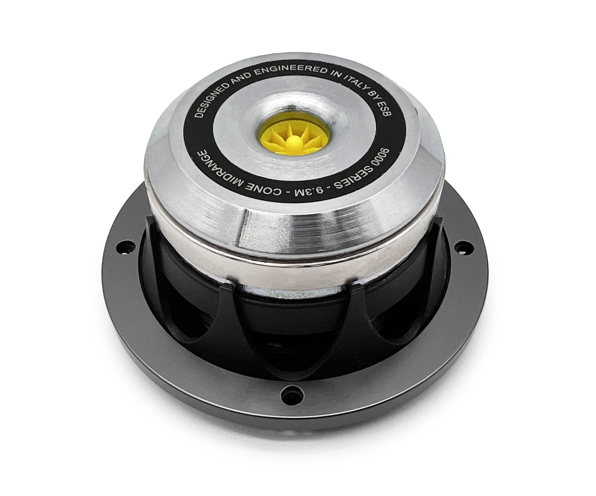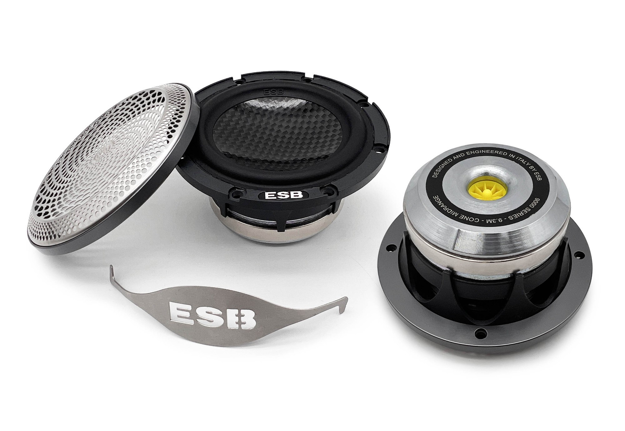 ESB Audio 9.3M predstavujú jednu z dvoch variantov stredových reproduktorov radu 9000. Jednotlivé modely sa líšia priemerom membrány a niekoľkými ďalšími parametrami i technológiami, na druhú stranu majú veľa technologických aj dizajnových riešení spoločných. Na prvý pohľad vás zaujme dizajn stredového reproduktora na čele s karbónovou membránou, nádherným košom v kvetinovom dizajne a voliteľnou mriežkou z hliníka opracovaného na CNC. Membrána je vyrobená z vákuovo a autoklávovo lisovaného vysokopevnostného karbónu. Snáď neexistuje ideálnejšia kombinácia ľahkosti a tuhosti na vyváženie výchyliek membrány pri nízkych a veľmi vysokých frekvenciách. Táto technológia sa v reproduktoroch kvôli svojej cene používa len zriedka, prináša však obrovské výhody čo sa týka prirodzenosti reprodukcie a vysokej dynamiky pri prechodových javoch. Membrána je vyrobená z jedného kusu bez prachovky, čo prináša neuveriteľné výhody v oblasti rozptylu a pravidelnosti frekvenčnej odozvy vo vyššom strednom pásme. Záves z NBL gumy má tvar navrhnutý tak, aby zaisťoval veľmi plynulý pohyb s nízkym vybočením, ktorý sa s blížiacim sa limitom stáva stále kontrolovanejším. Aj to prispieva k tomu, že je tento reproduktor mimoriadne dynamický a schopný zvládnuť veľké výkony. Perfektné spojenie eliminuje nežiaduce rezonancie a deformácie membrány. Dokonca aj zvukové vlny vo vnútri membrány sa rozptýlia oveľa lepšie ako v prípade tradičného zavesenia. Hrúbka odpruženia je navyše diferencovaná na uľahčenie malých pohybov a zlepšenie celkového zvuku reproduktora. Za zmienku stojí aj práškovo lakovaný kôš reproduktora z hliníkového odliatku, ktorý kladie veľmi malý odpor pri prechode vzduchu a jeho tvar znižuje vibrácie a rezonancie. Veľký neodymový magnet je odolný voči vysokým teplotám a je jedným z najvýkonnejších magnetov pre stredotónový reproduktor tejto veľkosti. Magnet zaisťuje enormnú magnetickú silu aj po hodinách hrania a generuje neuveriteľnú hnaciu silu pre dokonalé ovládanie cievky, vysokú rýchlosť prechodovej odozvy a umožňuje výrazne zmenšiť veľkosť a objem magnetického motora. Medzi exkluzívne technológie reproduktorov radu 9000 patrí TCA systém. Ten riadi prúdenie vzduchu pohybujúceho sa membránou a vytvára aperiodický tlmiaci odpor. To znamená, že uvoľňovanie energie nahromadené pri pohybe membrány prebieha kontrolovane a rýchlo bez toho, aby vznikali trvalé oscilácie. To prispieva k presnejšej a vernejšej odozve na zdroj zvuku a k presnosti a celkovej kvalite zážitku.