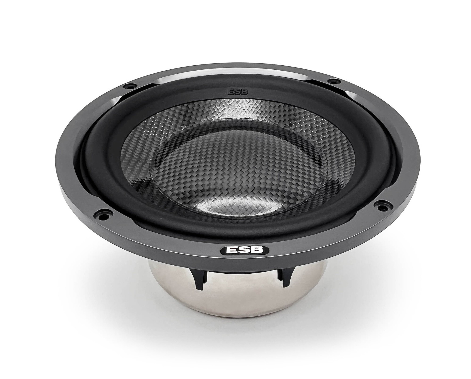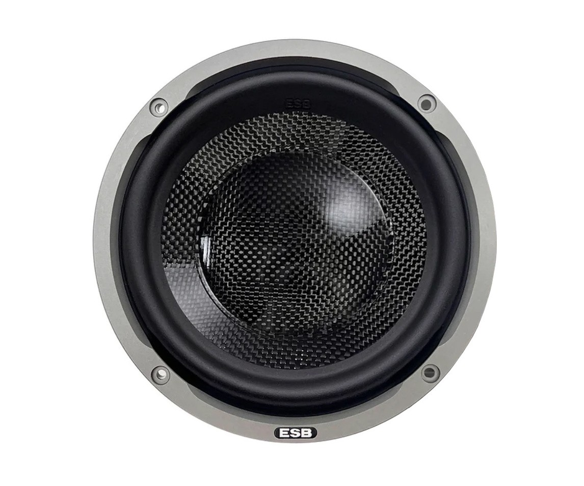 Reproduktory ESB Audio 9.6W na prvý pohľad zaujmú svojim neopozeraným dizajnom na čele s karbónovou membránou, nádherným košom v kvetinovom dizajne a voliteľnou mriežkou z hliníka opracovaného na CNC. Membrána je vyrobená z vákuovo a autoklávovo lisovaného vysokopevnostného karbónu s modulom tvarovaným systémom M+F. To zaručuje dokonalú geometriu a priľnavosť uhlíkových vlákien k sebe, čím vzniká materiál s extrémnou tuhosťou, veľmi vysokou schopnosťou prenosu zvuku, ale aj s vynikajúcim vnútorným tlmením. A to všetko pri veľmi nízkej hmotnosti a stálom výkone, pretože karbón je necitlivý na zmeny vlhkosti a teploty. Súčasťou membrány je prachovka vyrobená taktiež z uhlíkových vlákien, čím tvorí jeden dokonalý celok. Pri použitej cievke veľkých rozmerov má tvar, hmotnosť a tuhosť prachovky zásadný vplyv na zaistenie hlbokých, rýchlych a dynamických basov. Záves z NBL gumy má tvar navrhnutý tak, aby zaisťoval veľmi plynulý pohyb s nízkym vybočením, ktorý sa s blížiacim sa limitom stáva stále kontrolovanejším. Aj to prispieva k tomu, že je tento reproduktor mimoriadne dynamický a schopný zvládnuť veľké výkony. Za zmienku stojí aj práškovo lakovaný kôš reproduktora z hliníkového odliatku, ktorý kladie veľmi malý odpor pri prechode vzduchu a jeho tvar znižuje vibrácie a rezonancie. Extrémne veľká kmitacia cievka zaisťuje jeden z najvyšších výkonov vo svojej triede a zaručuje neprekonateľný výkon a dynamiku reproduktora. Konštrukcia tejto kmitacej cievky umožňuje, že zostáva po väčšinu svojej exkurzie úplne ponorená v magnetickom poli, čím sa minimalizuje skreslenie. Predná časť kmitacej cievky je vyrobená z hliníka s vetracími otvormi a je čierno eloxovaná, aby sa lepšie odvádzalo teplo. Podsadená kmitacia cievka má kratšiu dĺžku vinutia ako je výška magnetickej medzery, čo umožňuje nižšie skreslenie pri nižších exkurziách a presnejšiu kontrolu nad pohybom kmitacej cievky. Veľkoryso dimenzovaný a veľmi silný neodymový magnet je odolný voči vysokým voči vysokým teplotám a umožňuje výrazne zmenšiť veľkosť a objem magnetického motora. Ekvivalentná magnetická sila s feritovým magnetom by vyžadovala väčšie rozmery ako celého reproduktora. Pólová doska získaná pomocou numericky riadeného stroja, nie lisovaním, výrazne znižuje konštrukčné tolerancie v prospech výkonu. Rad kanálikov privádza chladiaci vzduch, čím sa zvyšuje výkon woofera a jeho životnosť.