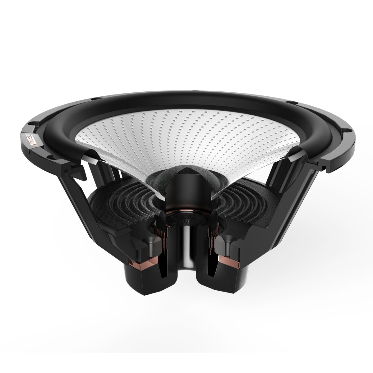 Aj magnézium-kompozitné stredové reproduktory presvedčia na plnej čiare, či už ide o výkonný neodymový magnet, perforovanú membránu, optimálnu symetriu magnetického poľa či kvalitný hliníkový koš. Spolu s výkonným neodymovým magnetom, ktorý bol obohatený chladiacimi kanálikmi, vzniká reproduktor extra triedy. Ručne potiahnutá textilná kalotka dodáva systému jemnejšie a jasnejšie stredové tóny. Impedančná linearizácia redukuje skreslenie na minimum. Made in Germany!