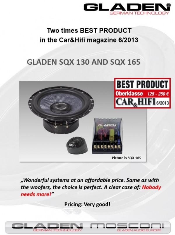 Víťaz testu vo vyššej triede v časopise Car & Hifi v roku 2013, to sú reproduktory Gladen z rady SQX.| Katalógové číslo | SQX 165 |