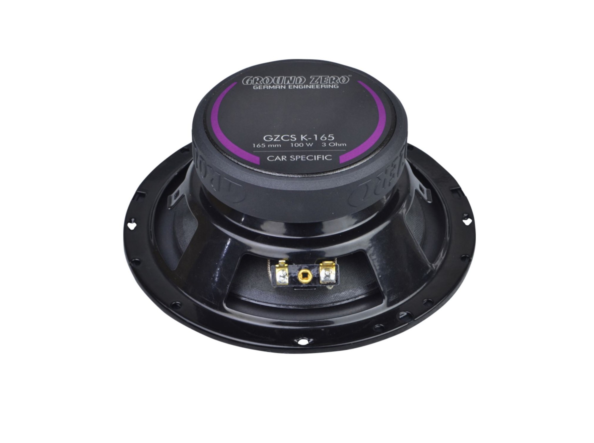 Väčšina OEM reproduktorových systémov nemôže úplne uspokojiť očakávania sofistikovaných zákazníkov. Najmä základná výbava necháva veľký priestor na vylepšenie dynamiky a kvality zvuku. Inštalácia aftermarket reproduktorov je jednoduchý spôsob, ako vylepšiť audio systém. Rad CAR SPECIFIC sa skladá z rôznych komponentov navrhnutých pre jednoduchú modernizáciu OEM audio systémov moderných automobilov. Ground Zero GZCS K-165VW je 165 mm stredobasový reproduktor pre vozidlá značky VW a identické značky.