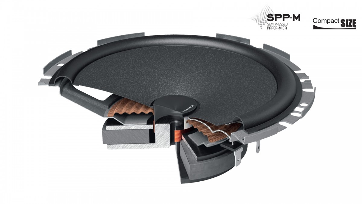 - 165 mm (6,5") pololisovaná papierová membrána SPP-M (Semi Pressed Paper-Mica), ktorá je obohatená práškom zo sľudy, pre dosiahnutie vynikajúcej rovnováhy medzi ľahkosťou a pevnosťou.