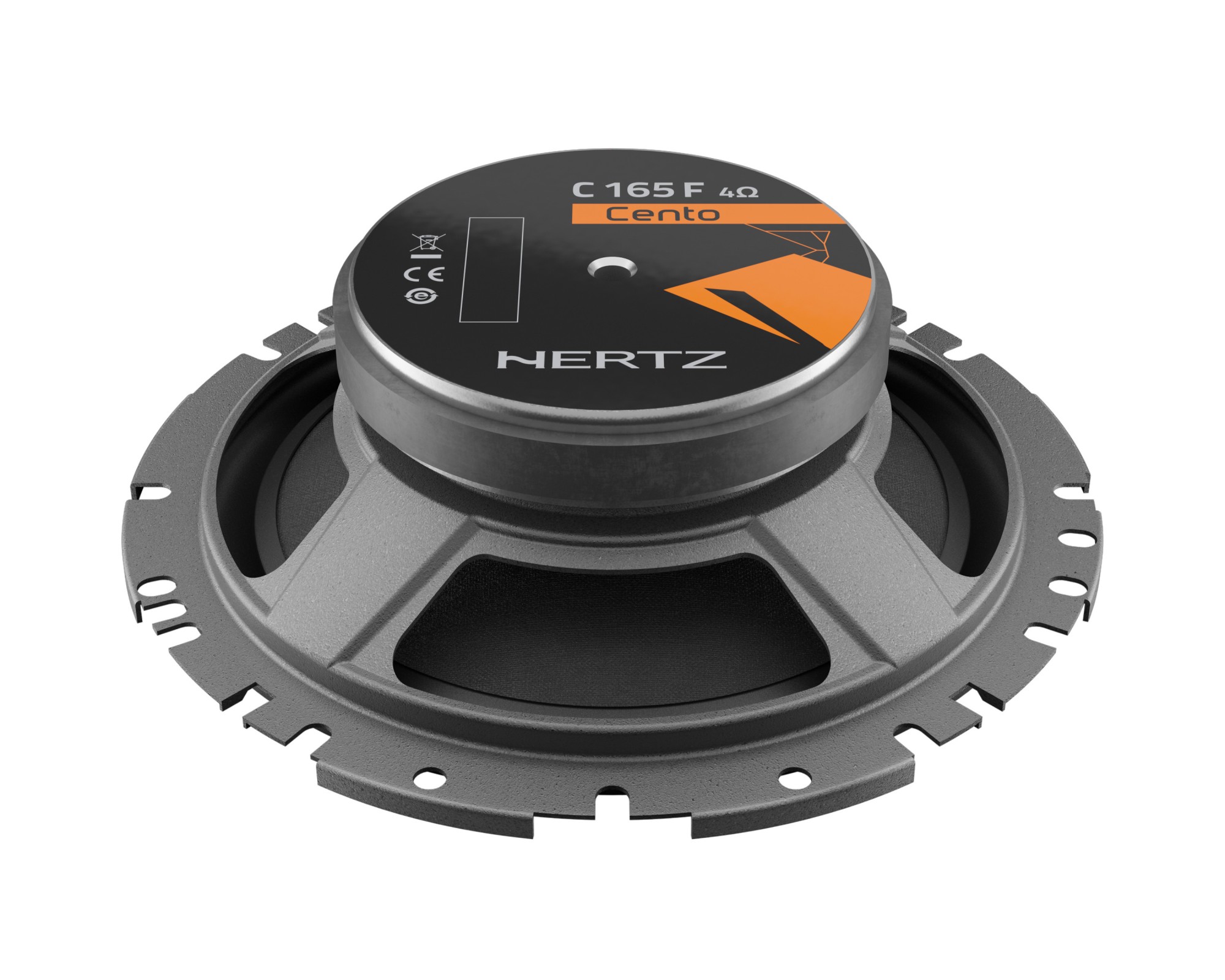 Komponentné 2pásmové reproduktory Hertz Cento CK 165 F disponujú ultra slim stredobasmi, ktoré sú ideálnym riešením do montáží, kde je problém s montážnou hĺbkou vo dverách. Hertz CK 165 F ponúka nový výškový reproduktor Hertz C 26 s 26 mm kalotou a 20 mm kmitacou cievkou pre detailnú a prirodzenú reprodukciu stredne vysokých frekvencií. Tím výskumu a vývoja dlho pracoval na optimalizácii charakteristík rozptylu výškového meniča C 26, aby maximalizoval výkon a prirodzené zafarbenie zvuku, ktoré podporuje frekvenčnú linearitu. Mnoho času bolo investovaných aj do výskumu dokonalého materiálu pre membránu stredobasu C 165 F - dlhým procesom bol vybraný SPP-M (Semi Pressed Paper-Mica), ktorý zachováva prirodzený zvuk pololisovaného papiera a prášok Mica zo sľudy zlepšuje tuhosť. Výsledkom je vynikajúca rovnováha medzi ľahkosťou a tlmením, ktorá je nevyhnutná pre výkonný a presný zvuk. Feritový magnet poskytuje vynikajúcu kontrolu aj pri vysokých výkonoch. Ultrakompaktné frekvenčné výhybky CCX 2 s možnosťou nastavenia výškového reproduktora (0, +3 dB) využívajú vybrané komponenty pre plný a pútavý zvuk. Mriežky CG 165 (obsiahnuté v balení) rozjasní interiér vozidla svojim sofistikovaným dizajnom. Sú vyrobené z vysoko odolného ABS plastu s kovovým pletivom a ponúkajú vysoký stupeň ochrany v kompaktnej veľkosti.
