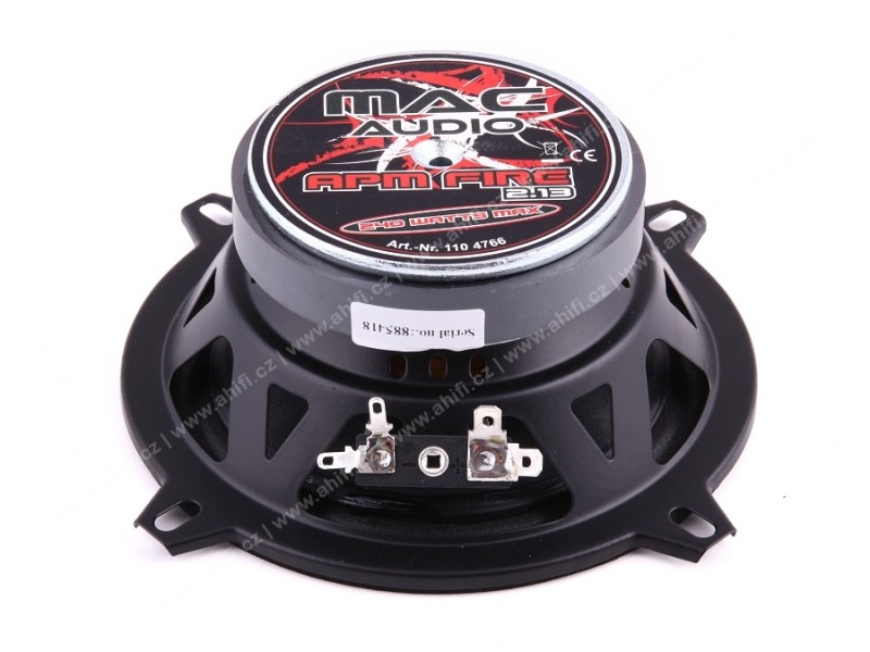 Vybrané materiály, super dynamický zvuk na svoju cenu a pekný dizajn, to sú reproduktory Mac Audio z najobľúbenejšieho radu APM FIRE. Materiál membrány tvorí vrstvený, lakovaný a špeciálne lisovaný papier, ktorý spoločne s ľahkým penovým závesom zaisťuje vynikajúcu účinnosť, zatiaľ čo robustný oceľový kôš s prídavnou ventiláciou kmitacej cievky zaručuje maximálnu odolnosť. Vďaka použitiu systému merania Klippel sa Mac Audio podarilo dosiahnuť optimálneho výkonu, rovnako ako homogénneho a presného magnetického poľa. Robustná mriežka s gravírovaným hliníkovým logom chráni 13 cm reproduktor. Správna voľba v danej cenovej relácii!