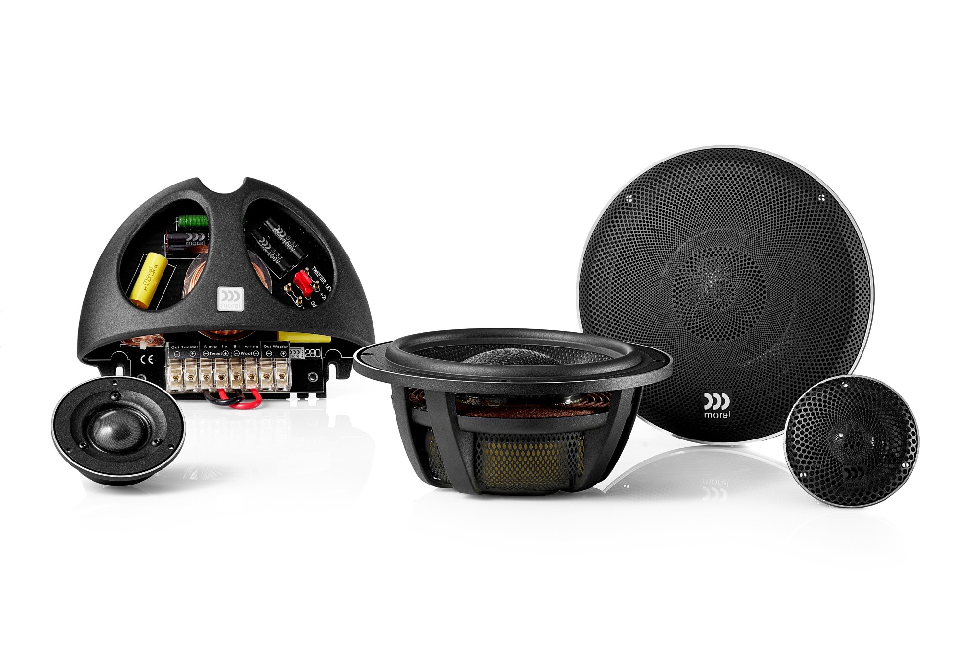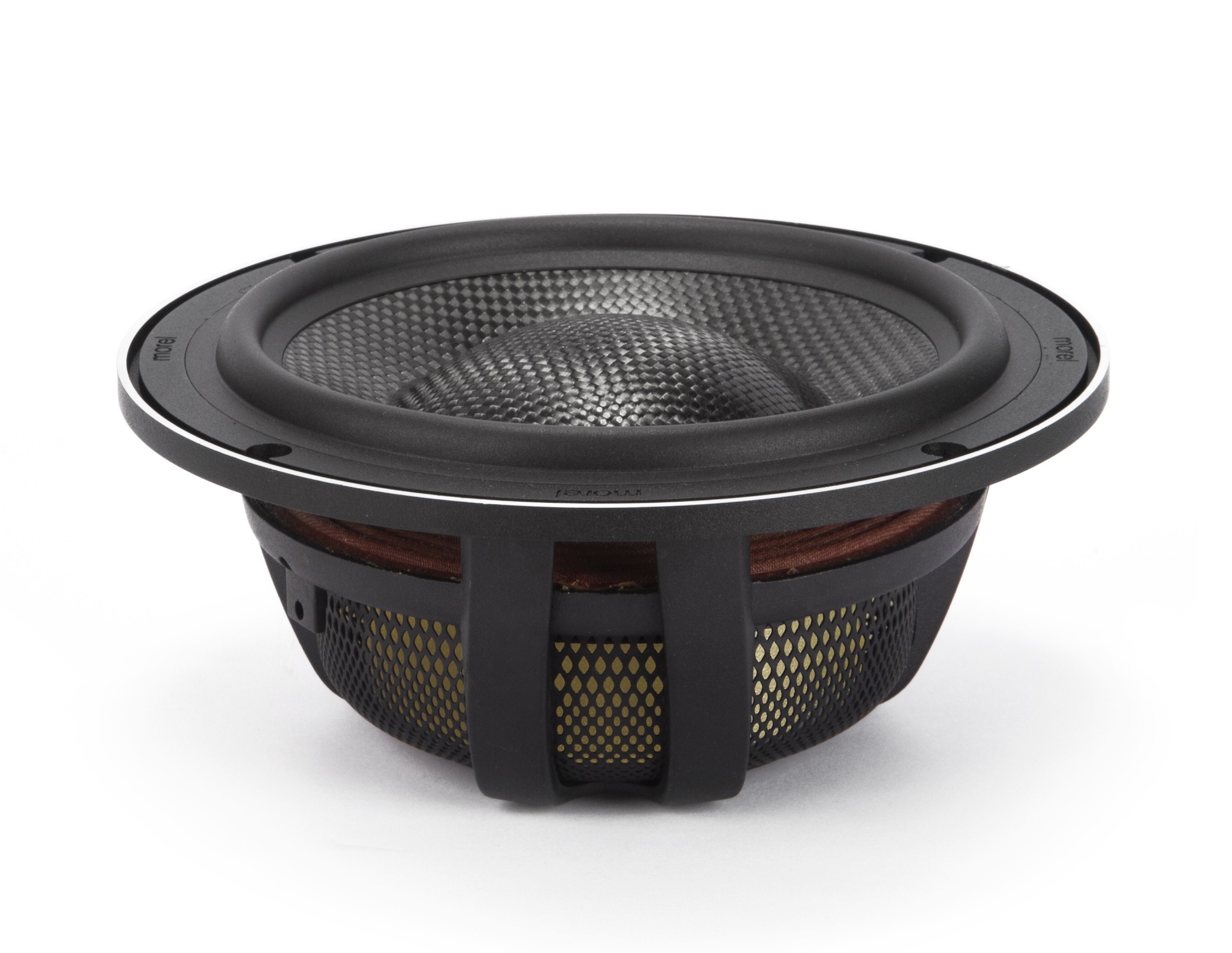 C.A.R. je riadený akustický odpor. Vo väčšine automobilových aplikácií sa reproduktory inštalujú do virtuálneho priestoru, napríklad do dverí, aby sa zabezpečilo minimálne akustické zaťaženie. Filter C.A.R. Filter™ zlepšuje akustické zaťaženie riadeným prúdením vzduchu vo vnútri reproduktora, čo má za následok až 30 % zlepšenie výkonu. To poskytuje väčšiu kontrolu nad pohybom membrány pre lepšiu dynamiku basov.Luxusná mriežka Morel Lotus
