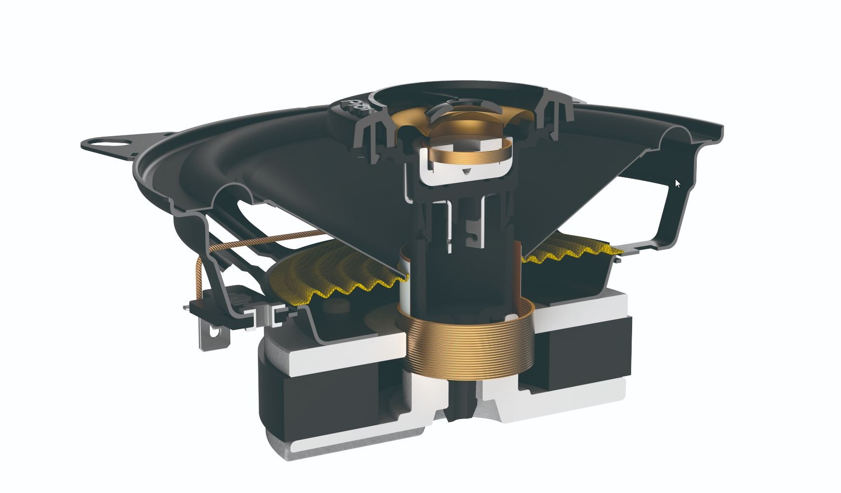 | Typy reproduktorov Koaxiálne reproduktory: Koaxiálne reproduktory sa vyznačujú konštrukciou tzv. Všetko v jednom. Výškový a stredobasový reproduktor sú v jednom koši. Výhodou je jednoduchšia montáž, ale vďaka spojeniu resp. blízkosti pásiem v jednom reproduktore, sa zvyčajne zníži kvalita zvuku. Spravidla uprostred stredobasového reproduktora, je výškový reproduktor, ktorého kmitacia cievka pracuje v druhej vzduchovej medzere spoločného magnatického obvodu. Trojpásmový koaxiálny reproduktor sa skladá zo stredobasového reproduktora, v predu na osobitnom nosníka je stredový reproduktor a samostatný výškový. Komponentné reproduktory: Komponentné reproduktory sa vyznačujú rozdelením na jednotlivé frekvenčné pásma, výškové + stredobasové + popr. basové pásmo. Jednotlivé reproduktory sa dajú umiestniť úplne oddelene, čo má za výsledok lepší zvukový aj akustický prejav. V drvivej väčšine prípadov komponentných reproduktorov je dodávaná aj externá výhybka, ktorá rozdeľuje výškové, stredové / stredobasové a u třípásma aj basové pásmo popr. umožňuje nastavenie decibelovej úrovne u výškového reproduktoru (napr. +2 dB, 0 dB, -2 dB), strmosti (napr. 6dB / okt. 12dB / okt.) či aktívne alebo bi-amp zapojenia. | Koaxiálne 2pásmové |