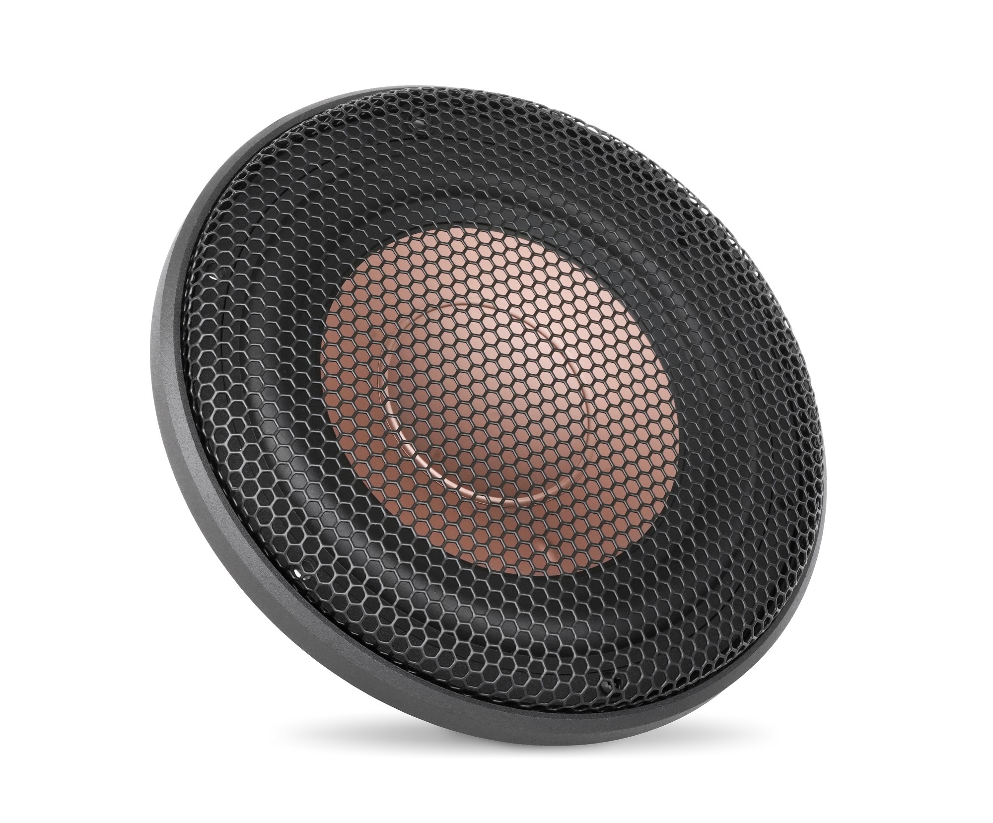 Pri stredobasových reproduktoroch RG 6 HD na prvý pohľad zaujme nádherný dizajn membrány. Kombinácia čiernej a medennej farby je neuveriteľne elegantná a taktiež veľmi netradičná. Nemenej zaujímavé je však zloženie membrány a použitej technológie. Membrána je vyrobená z patentovaného materiálu Matrix Alloy Dome zo zliatiny horčíka a hliníka. Táto kombinácia vyniká excelentnou tuhosťou, schopnosťou tlmiť vibrácie a tiež príkladnou ľahkosťou, čo umožňuje reprodukciu hlbokých a pôsobivých basov pri zachovaní čistých a presných stredných frekvencií. Čo však skutočne odlišuje tieto reproduktory od všetkej konkurencie je vyosenie membrány, ktoré je prispôsobený aj kôš reproduktoru. Toto technologicky náročné riešenie membrány pomáha výrazne zlepšiť celkovú frekvenčnú odozvu týchto reproduktorov, ktorá by nebola v prípade použitia klasickej membrány mysliteľná. Tento dizajn membránu navyše spevňuje bez zvýšenia hmotnosti a taktiež zväčšuje rozmer membrány, čo oceníte v podaní basovej zložky. Za zmienku stojí aj príkladne plochá frekvenčná odozva stredobasu, ktorá patrí medzi spoločné poznávacie znaky všetkých reproduktorov Audible Physics a RG Sound Labs. Odolný záves minimalizuje pohyby, ktoré by mohli spôsobiť kontakt s 25 mm kmitacou cievkou a robustným feritovým magnetom s rozmermi 80 x 18 mm. Špeciálne navrhnutý liaty kôš reproduktora je výnimočne tuhý, eliminuje vibrácie a nedeformuje sa toľko pri pohybe membrány, ako to býva v prípade klasických oceľových košov. Zároveň neznižuje magnetické pole a výrazne účinnejšie odvádza teplo z kmitacej cievky. Na koši zaujmú aj masívne káblové terminály, ktoré sme zvyknutí vídať skôr na klasických subwooferoch. Cievka a ďalšie medené komponenty sú vyrobené z najkvalitnejšej medi dovážanej z Japonska a Ruska, ktorá je známa svojou výnimočnou vodivosťou a odolnosťou. V balení nájdete aj dizajnové hexagón mriežky pre stredobasové reproduktory.